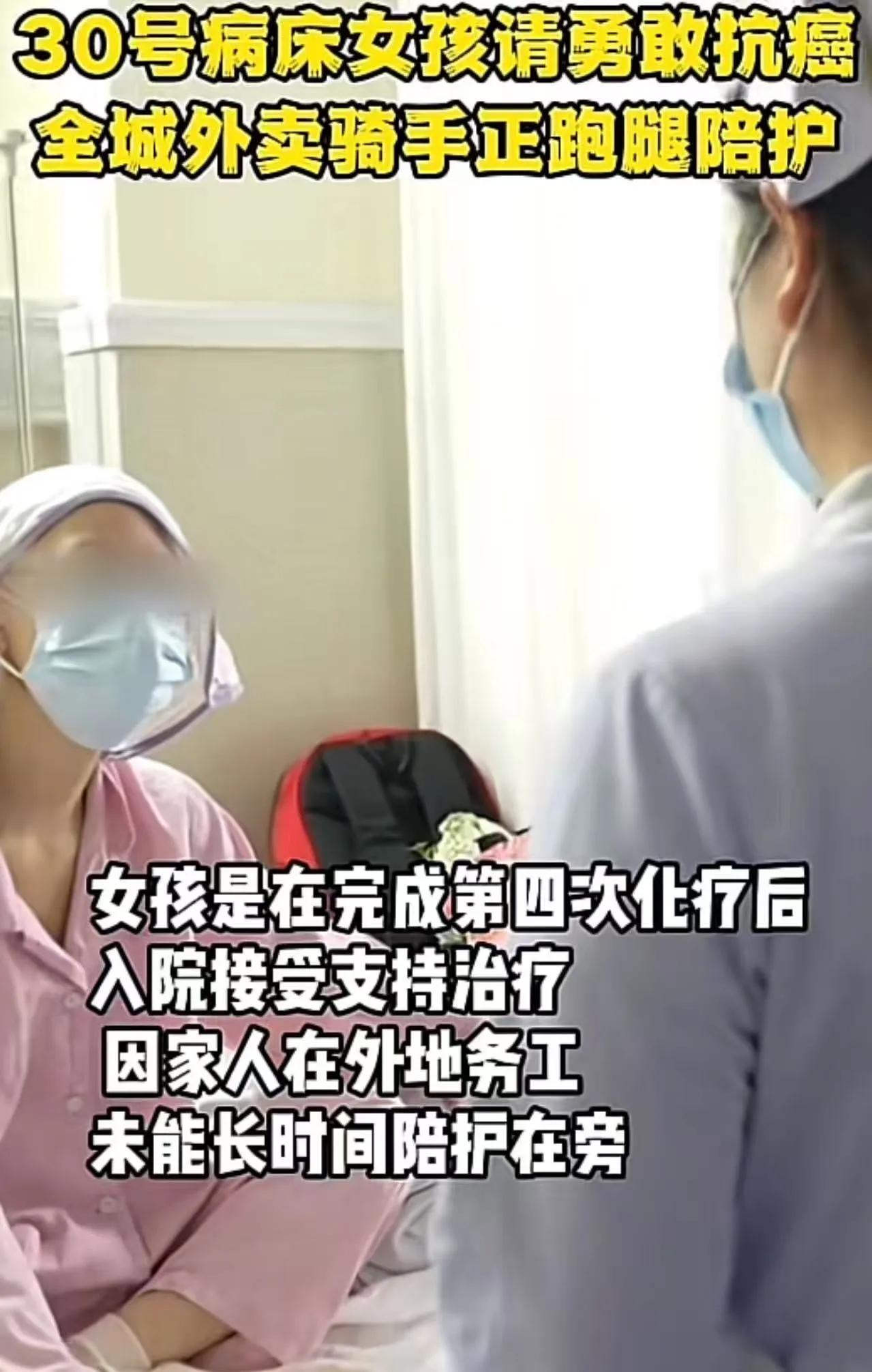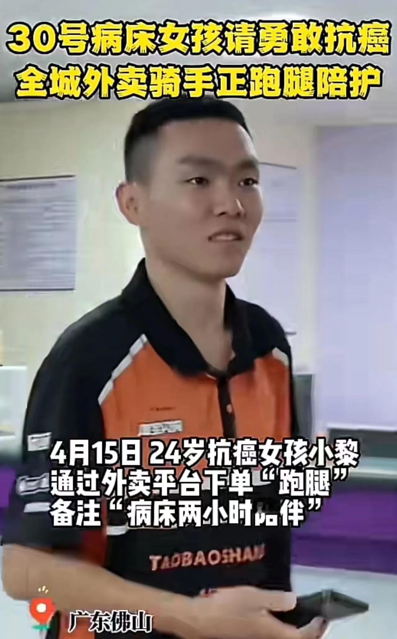 看哭了!广东佛山,外卖小哥接到一份特殊订单,顾客备注:“不需送东西,来医院陪我聊两个小时,钱照付……”小哥到了医院后,瞬间绷不住了!下单的是一个24岁女孩,年纪轻轻已经化疗四次!之后,一场感动全网的爱心接力,在病房上演!