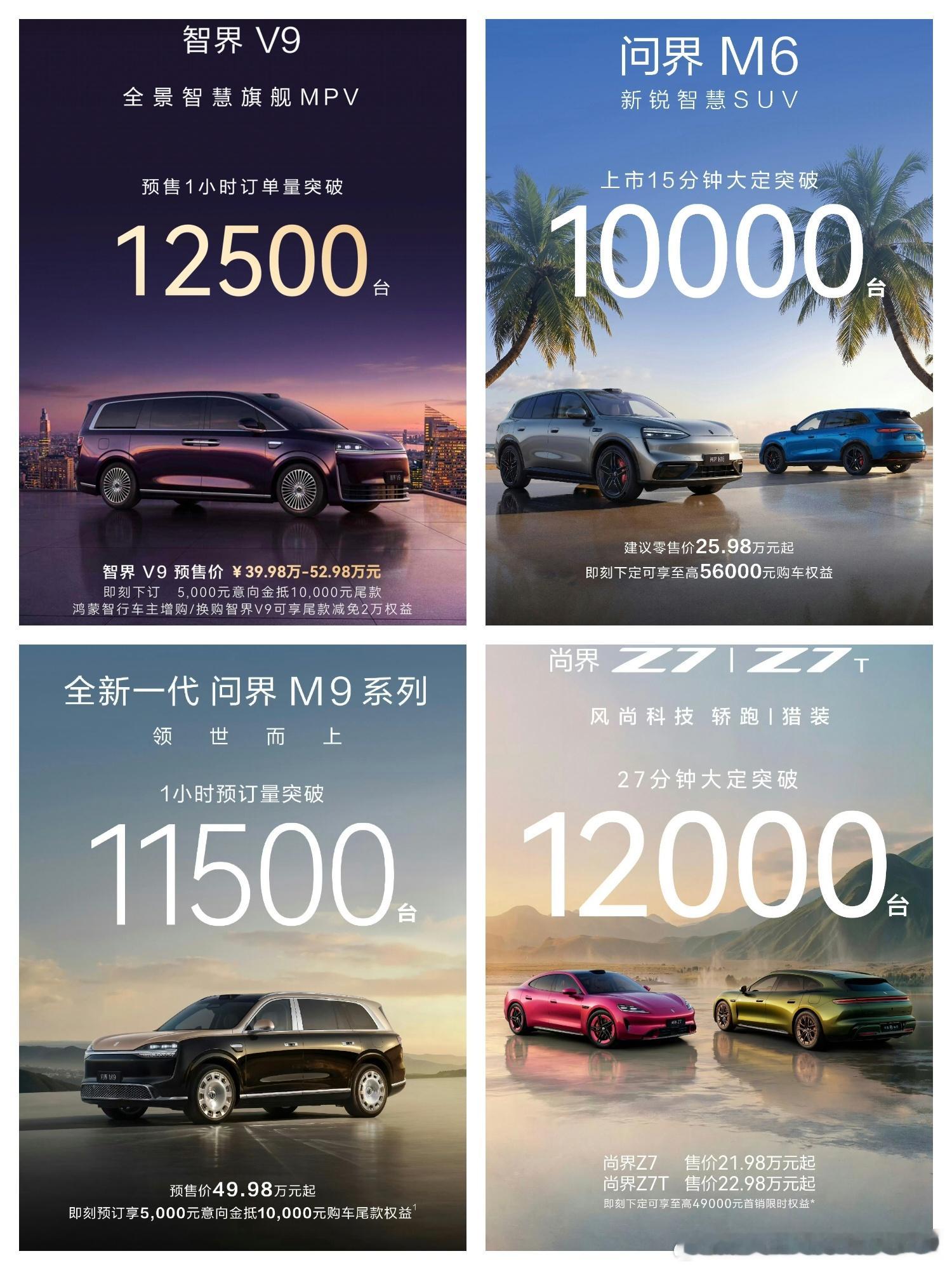 昨天的成绩单,智界V9预售1小时订单量突破125000台;问界M6上市15分钟大定突破10000台;全新一代问界M9一小时预订量突破11500台;尚界Z7系列27分钟大定突破12000台。