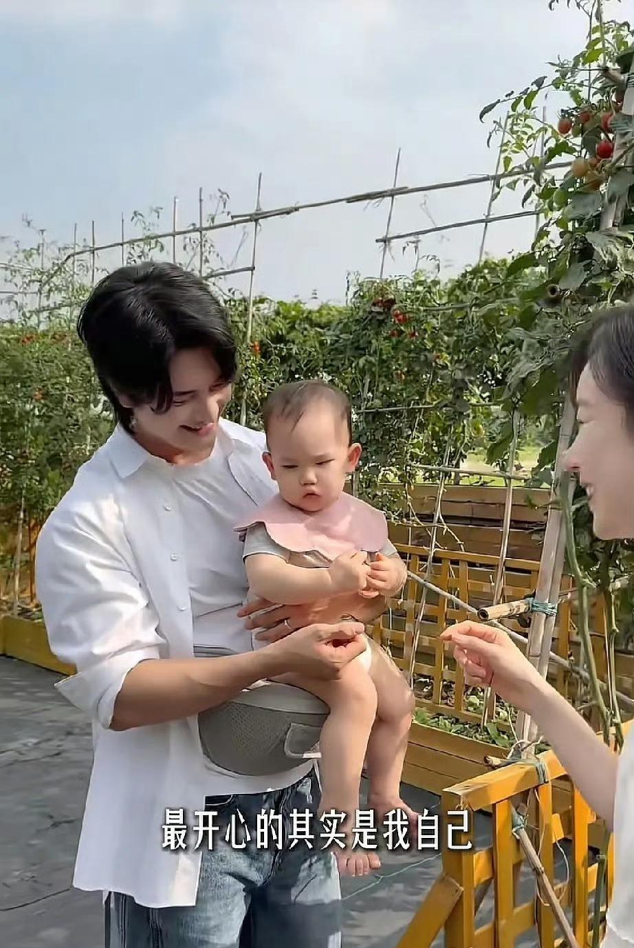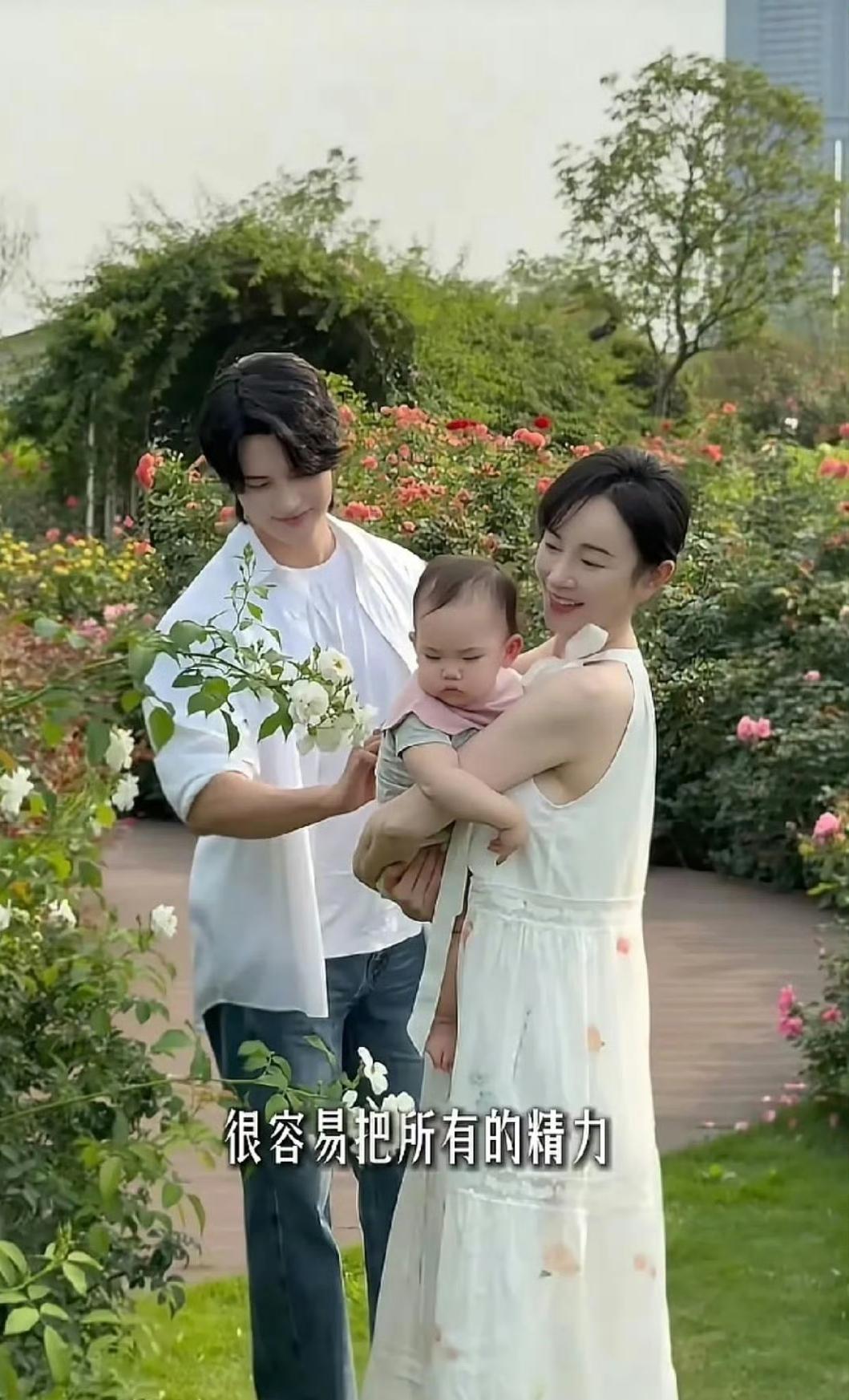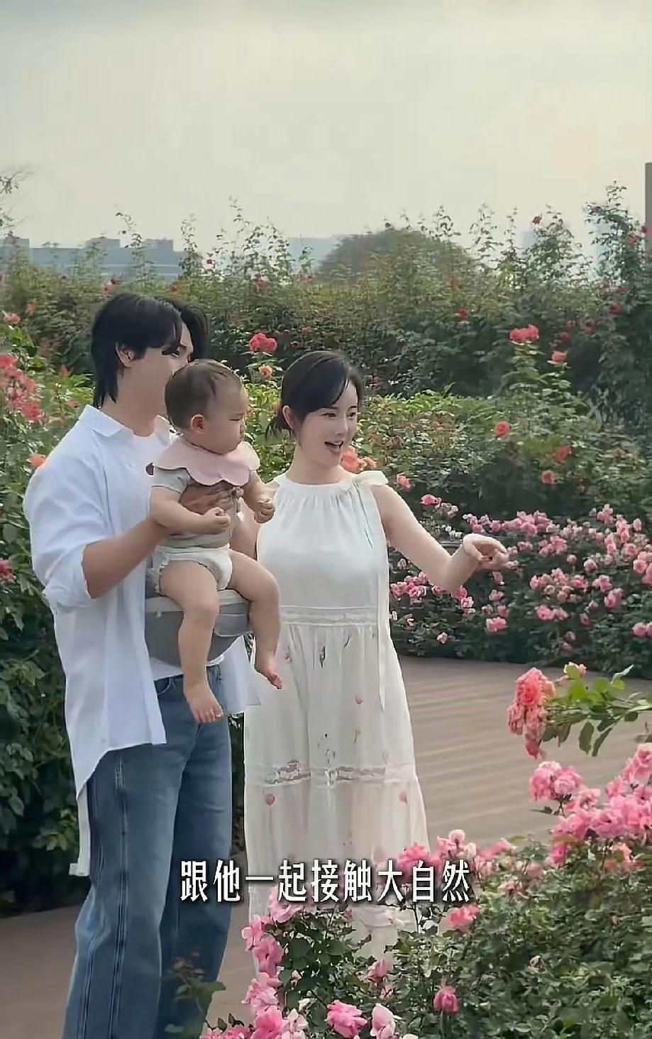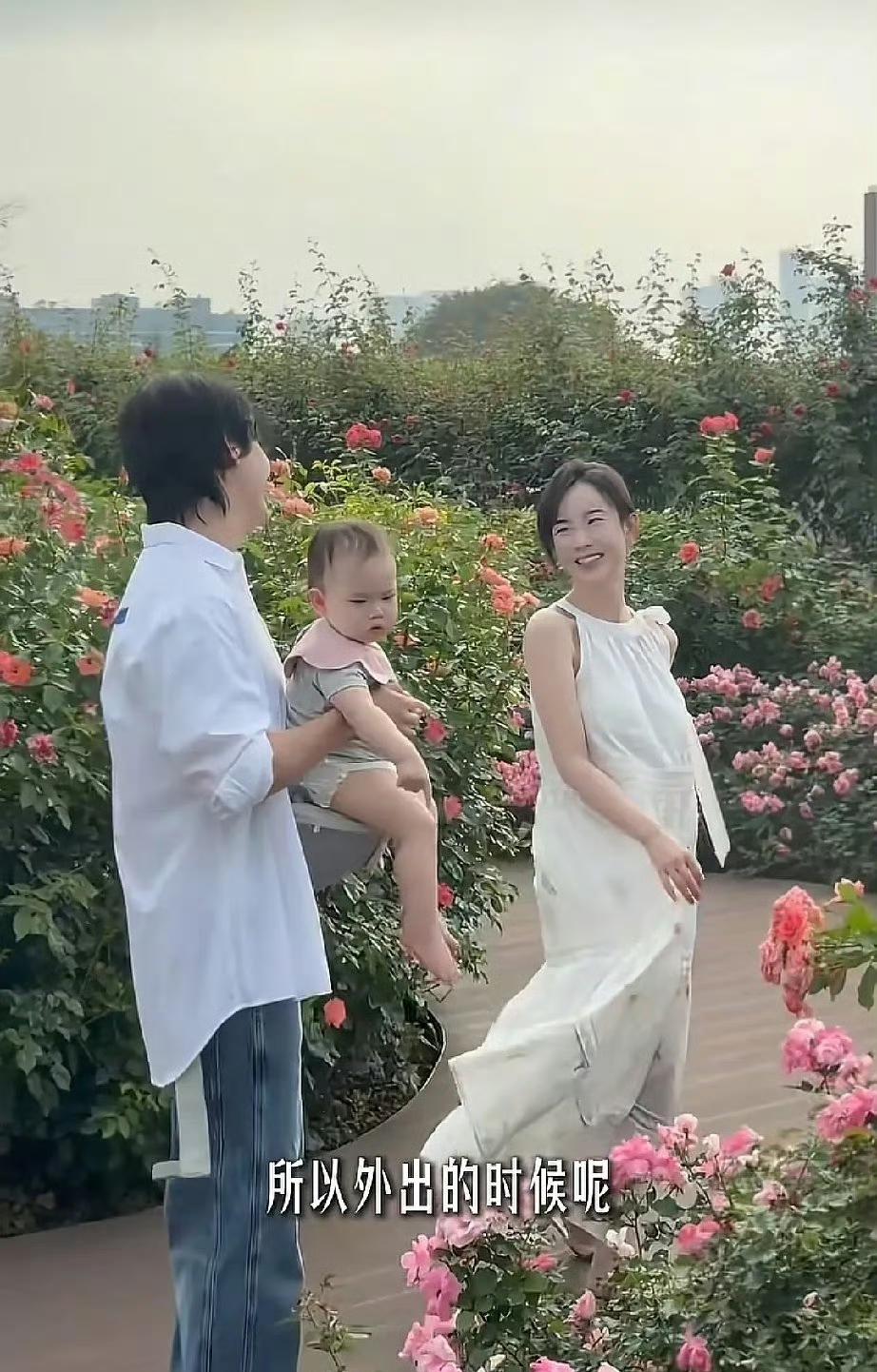 一周岁的Dylan刚满一岁,肉乎乎软萌萌,穿着尿不湿跟爸爸妈妈去花园闲逛,小五腰上挂着腰凳抱儿子,张檬则是开心在一旁逗儿子。