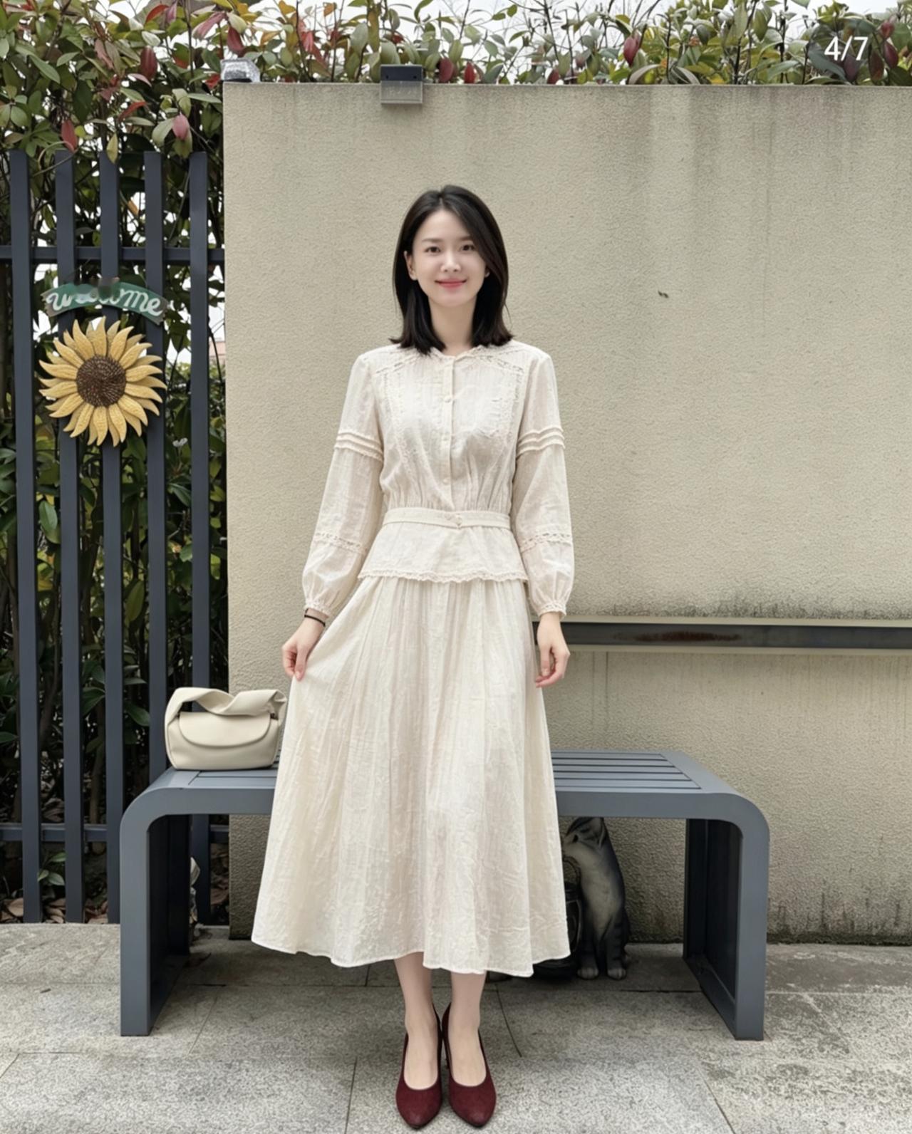 一袭米白色棉麻连衣裙,自带慵懒文艺气息,精致刺绣与收腰剪裁相融,温柔勾勒身姿。简约干净的穿搭,褪去繁杂修饰,尽显从容大方。