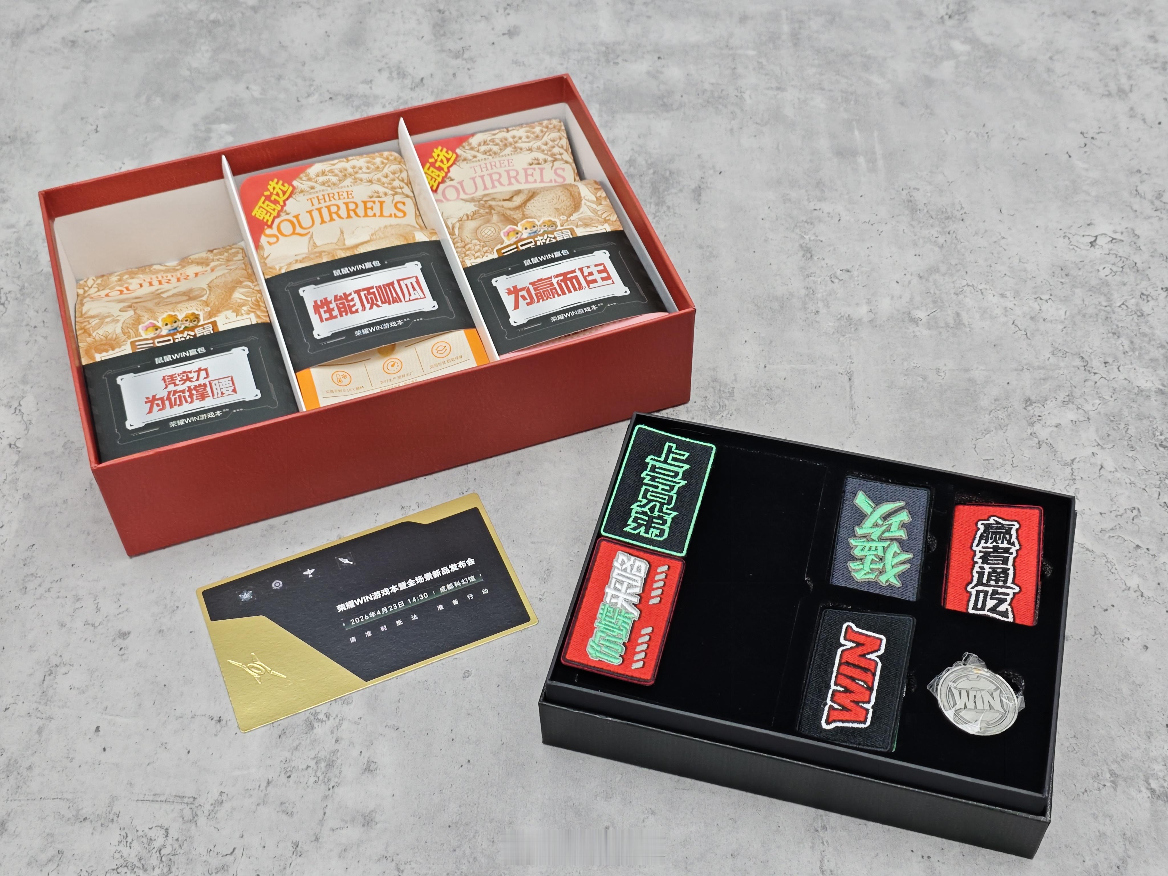 收到荣耀WIN游戏本的礼包,这次是一个超大的红包,感觉今晚又能猛攻出红了里面是三只松鼠的零食礼盒,跟定制WIN纪念币,梗味魔术贴,象征着鼠鼠玩家也能轻松得吃大家也可以期待一下4月23号的发布会,看看这次荣耀WIN游戏本能带来什么惊喜