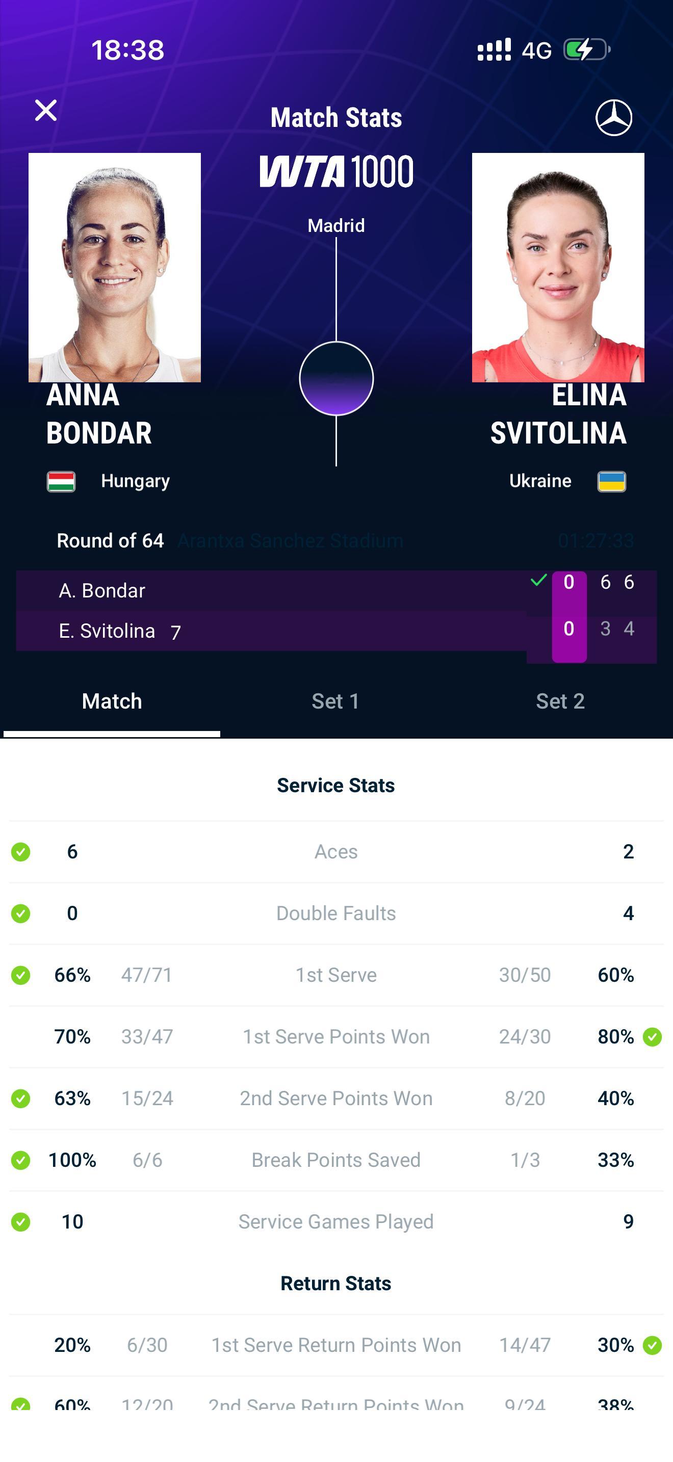 马德里1000赛 白菜被炖了,邦达尔6记ACE,6比3、6比4击败赛会7号种子斯