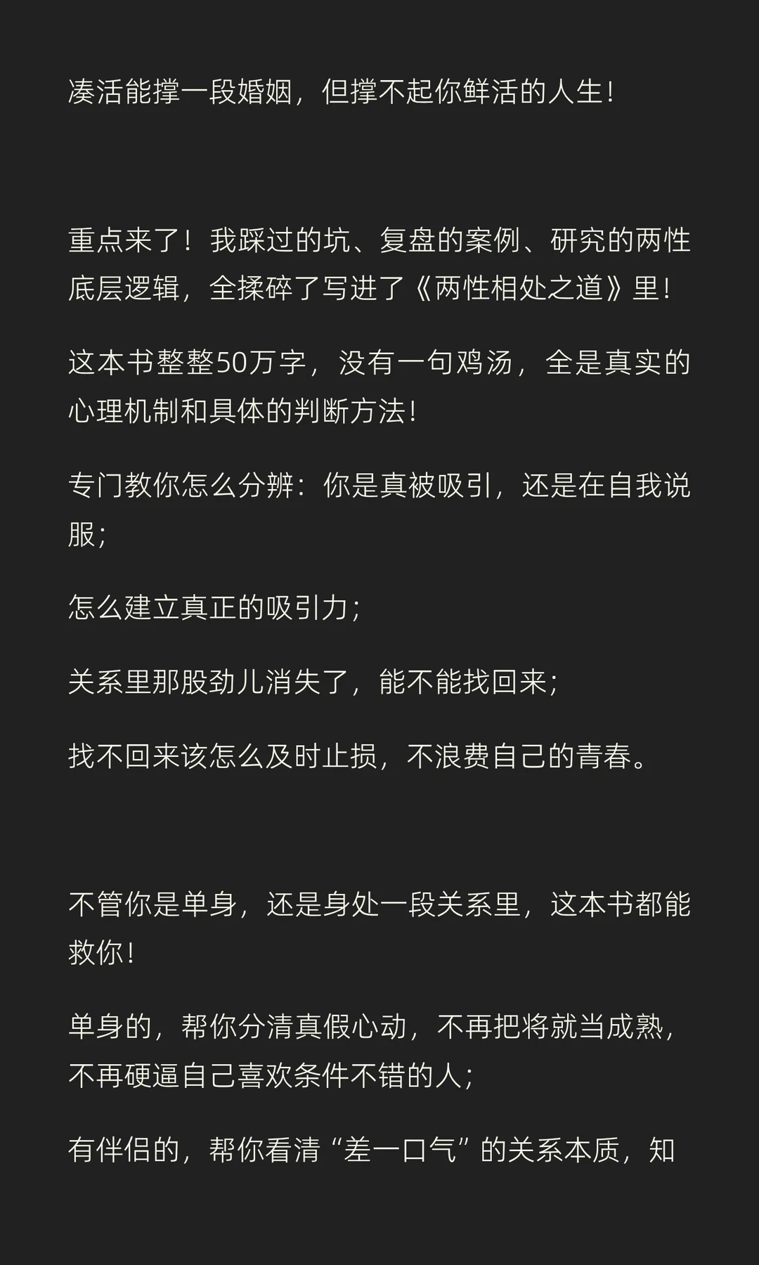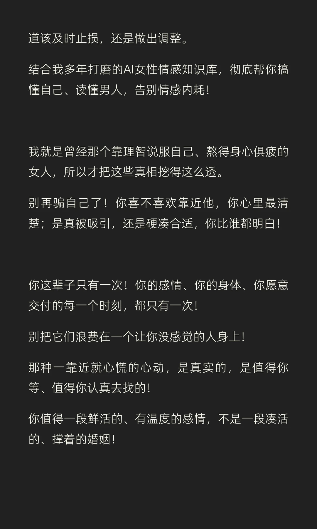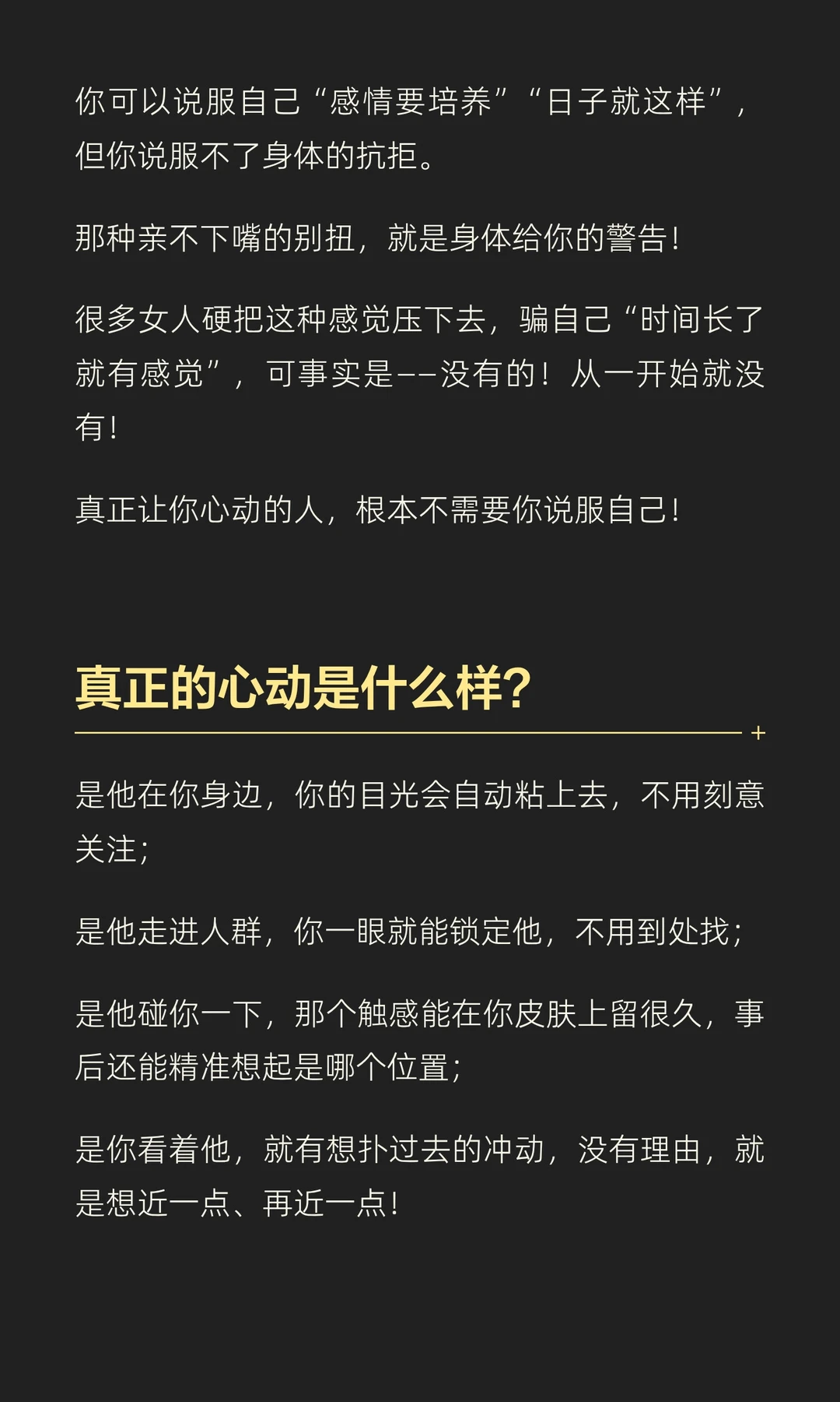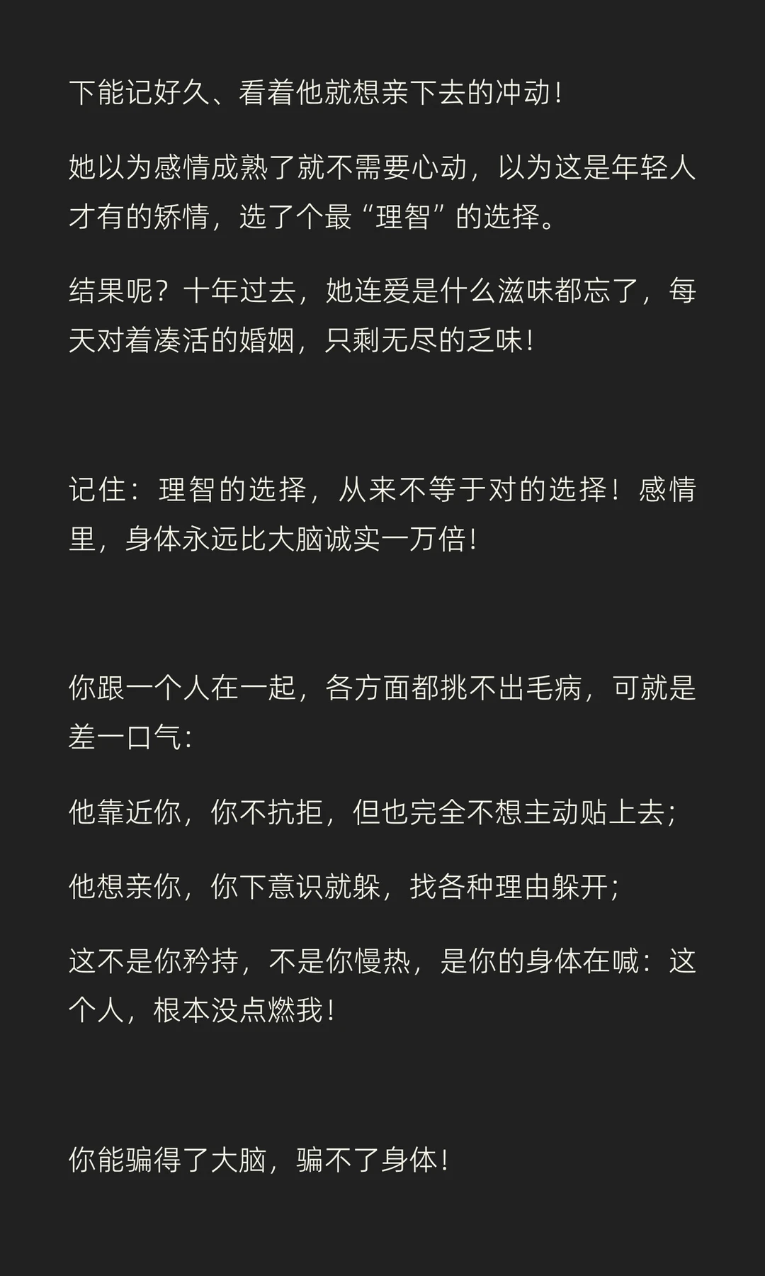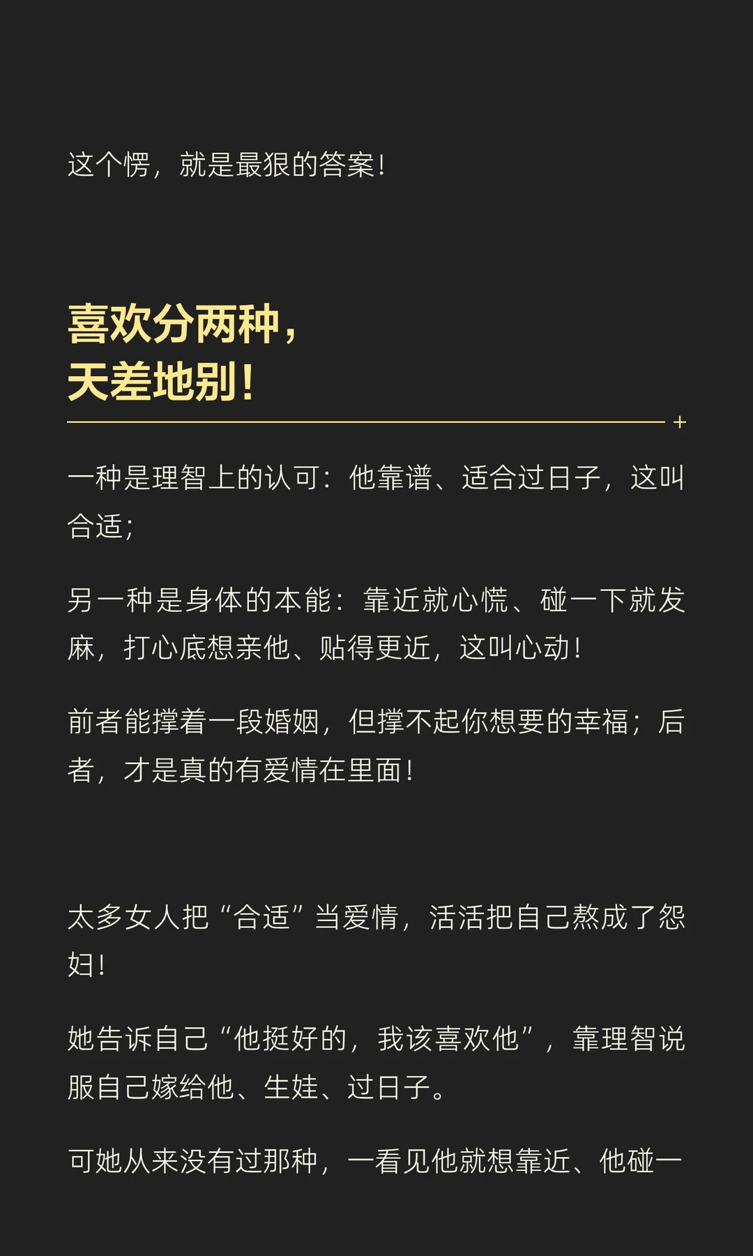 一段非常现实的话:“只要你硬撑过一段无性无话的婚姻三年,不用多,就一千天,你会