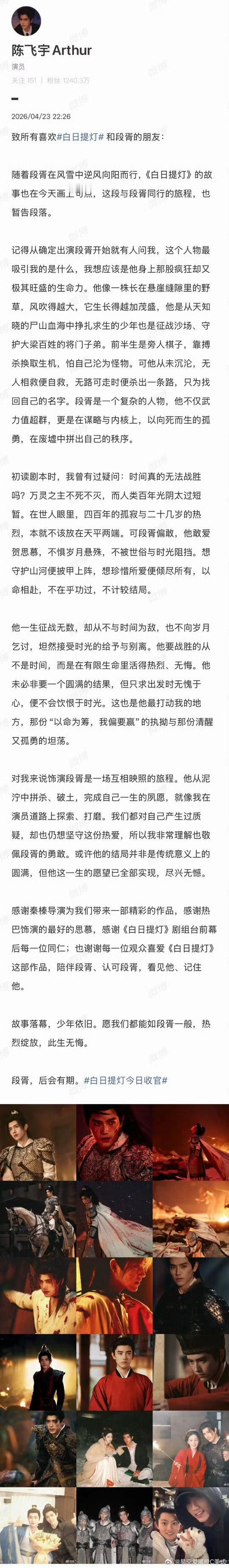 陈飞宇白日提灯收官文《白日提灯》正式收官,好好和段胥说声再见啦~从开机到杀青,再到剧集播出,陪着这个角色走过了很长一段路,用心演绎他的喜怒哀乐,感受他的人生与坚守,每一场戏、每一个镜头都格外珍惜。感谢剧组所有台前幕后的工作人员,一路同行,辛苦付出,才有了鲜活的段胥;也感谢每一位观众的喜欢与陪伴,见证角色的成长与落幕。段胥,就此别过!演员陈飞宇,不忘初心,继续前行,下个角色,我们不见不散!