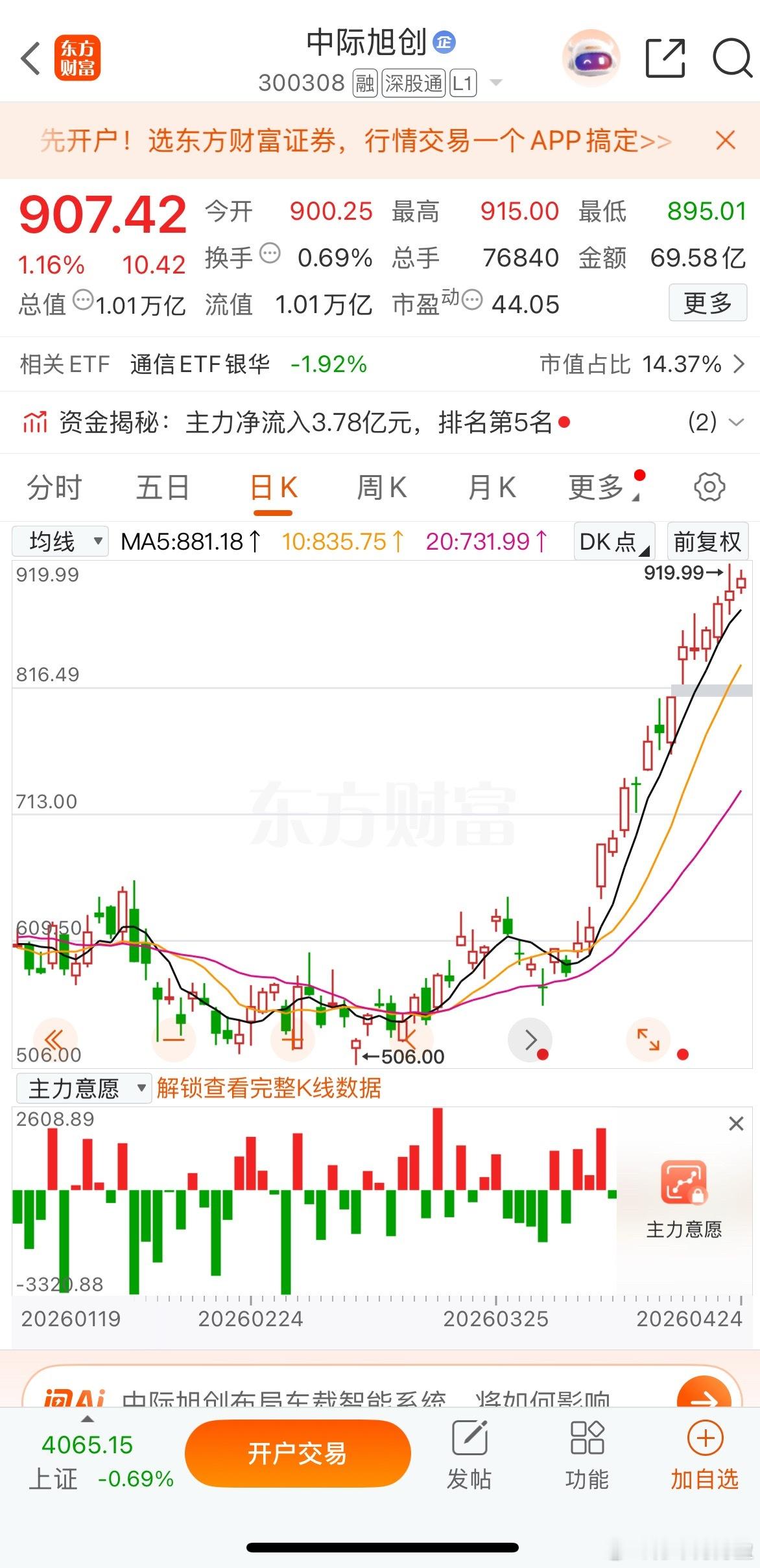 大盘绿油油的,$中际旭创 sz300308$ 继续向万亿俱乐部冲刺,无视大盘调整,是头犟牛,证券这个流氓,涨起来装傻,跌起来像天塌了似的…很不和谐,大盘震荡剧烈,量化开始收割了,此时切勿追高,等待低位科技股补涨机会。