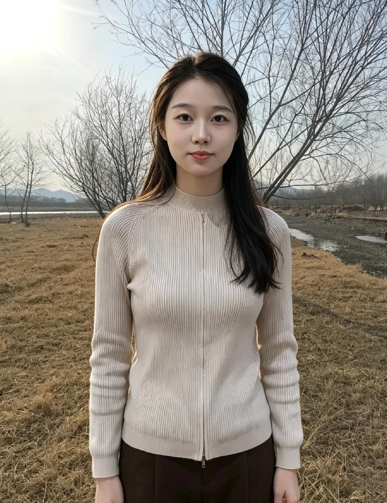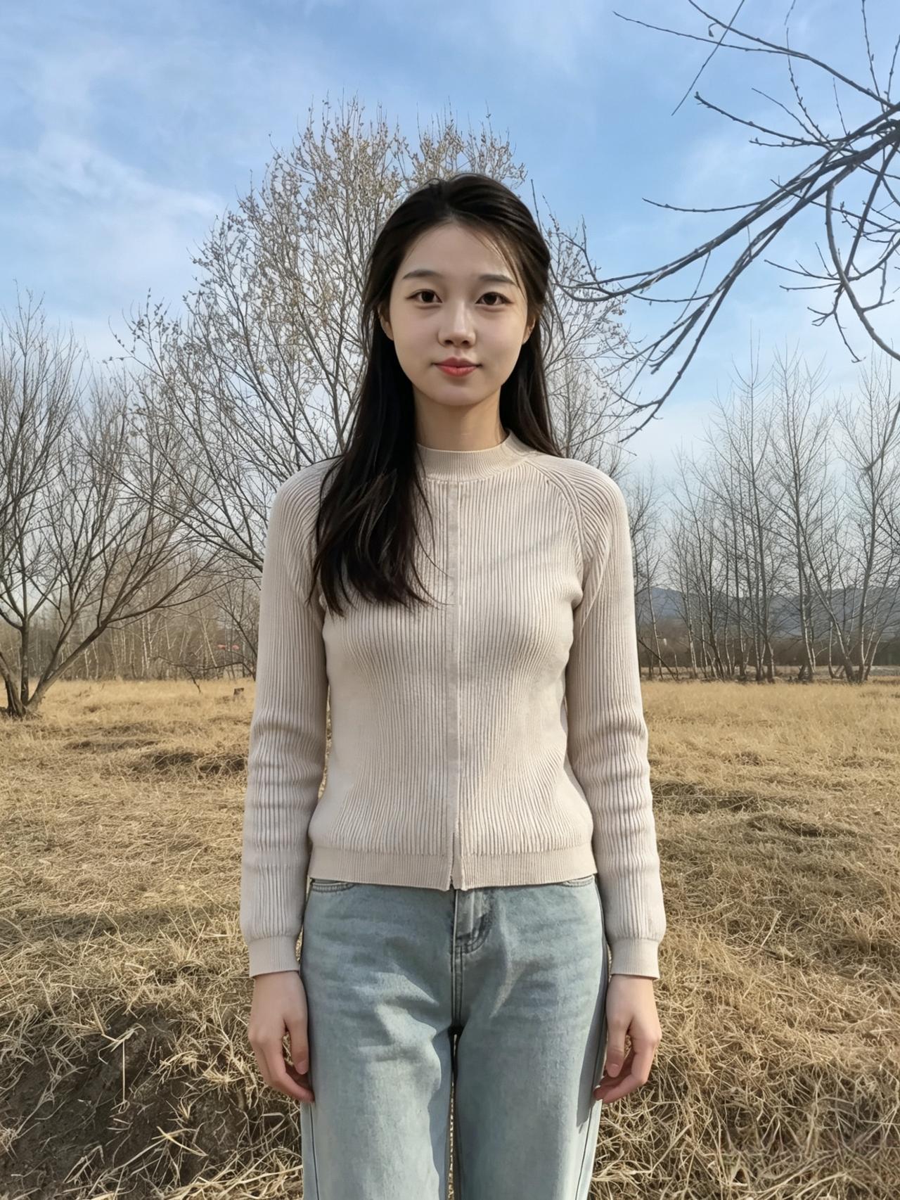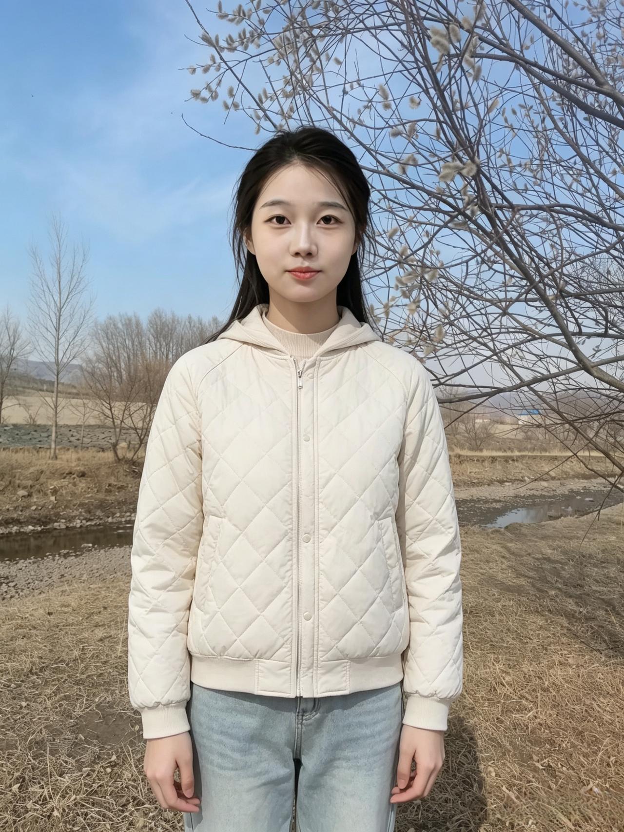 你站在枯草与蓝天之间 素色针织衫,是风揉碎的云 长发垂落,拂过初春的微凉 溪涧是