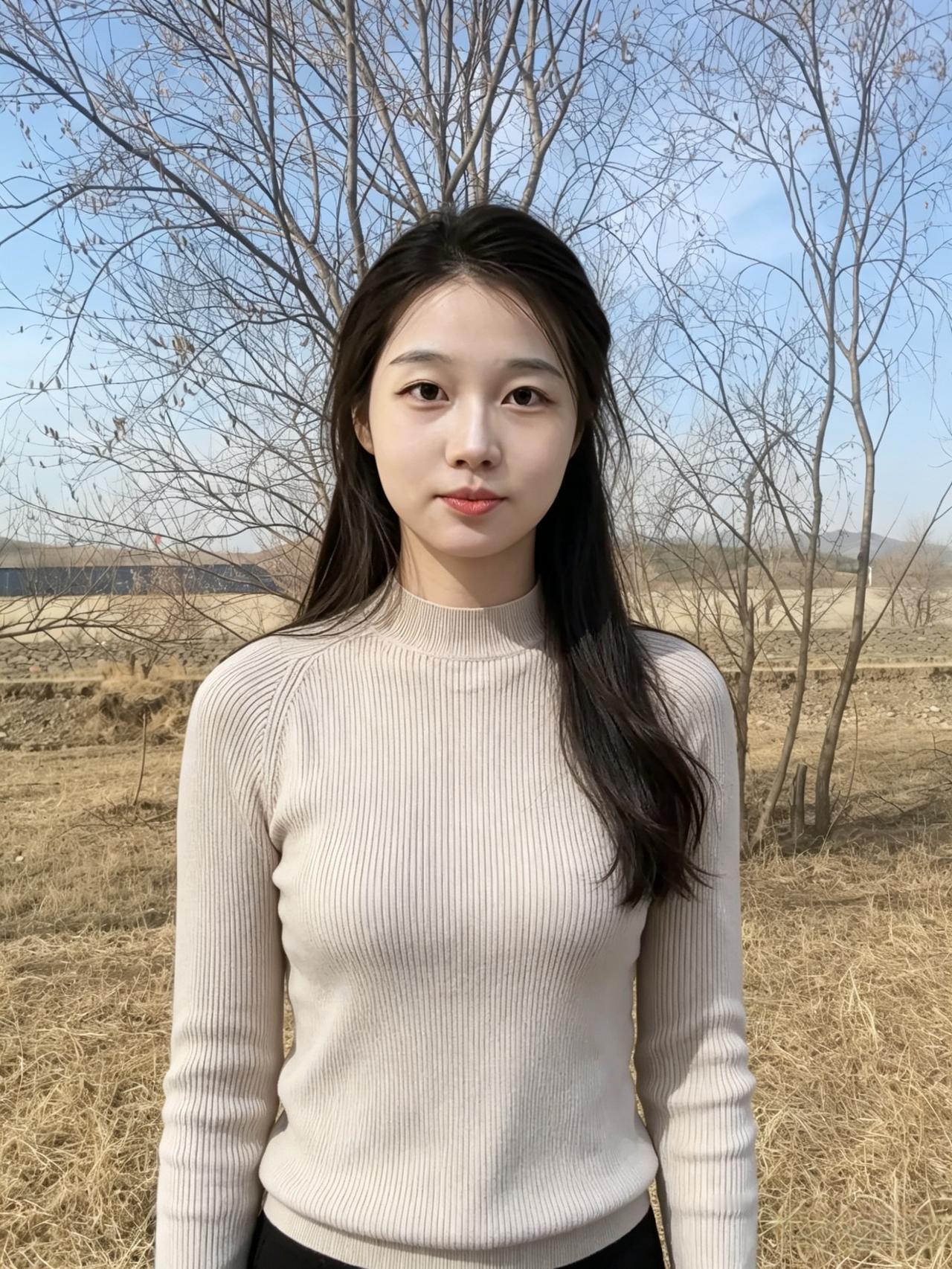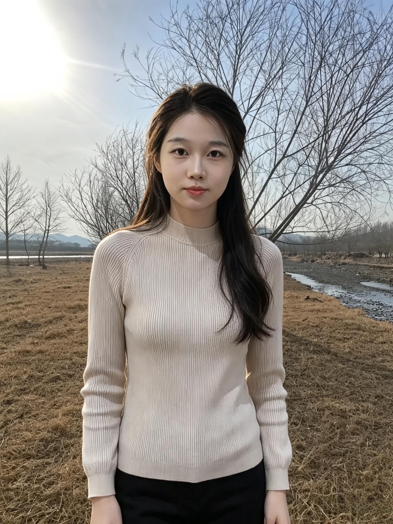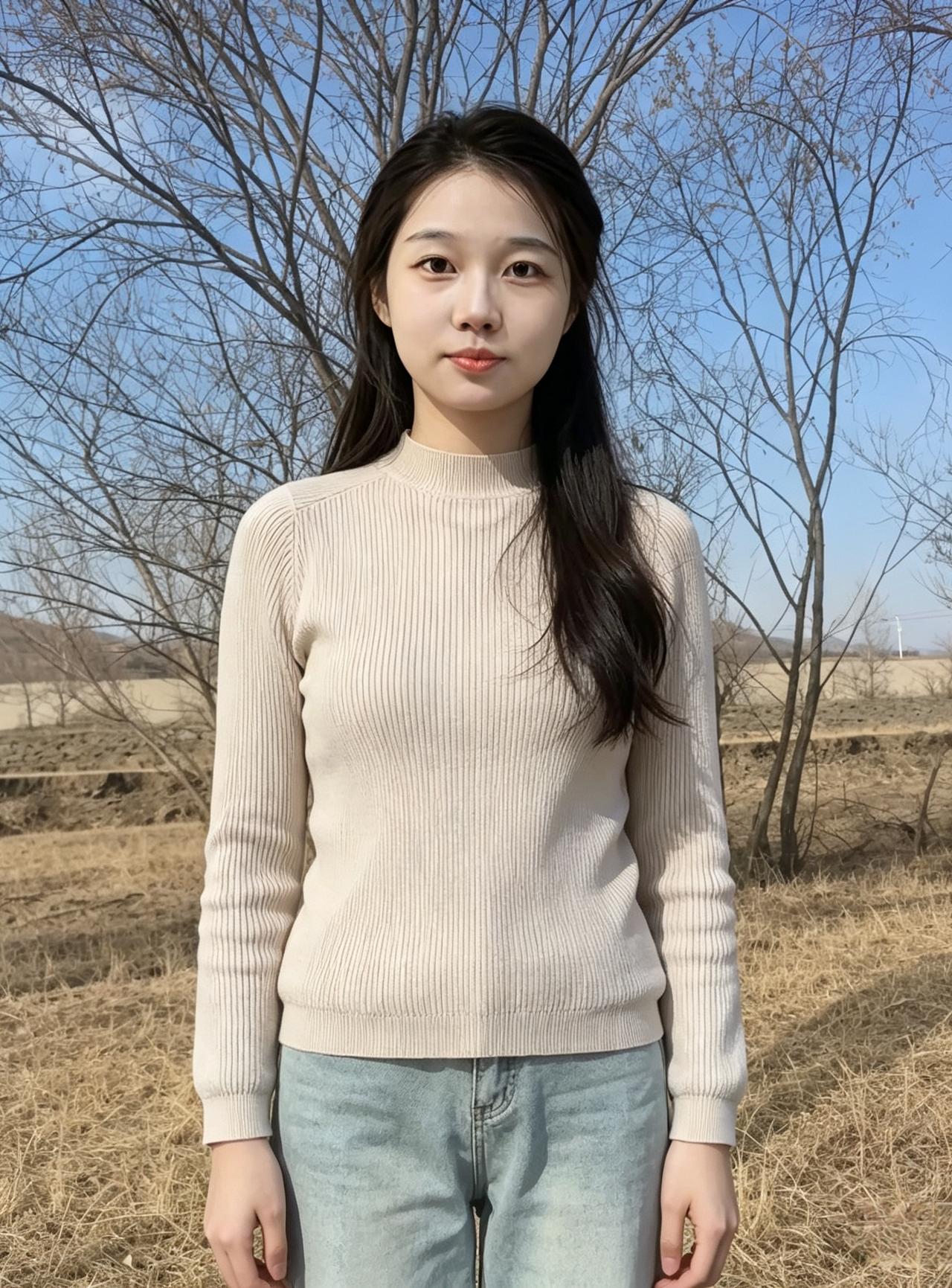 你站在枯草与蓝天之间 素色针织衫,是风揉碎的云 长发垂落,拂过初春的微凉 溪涧是
