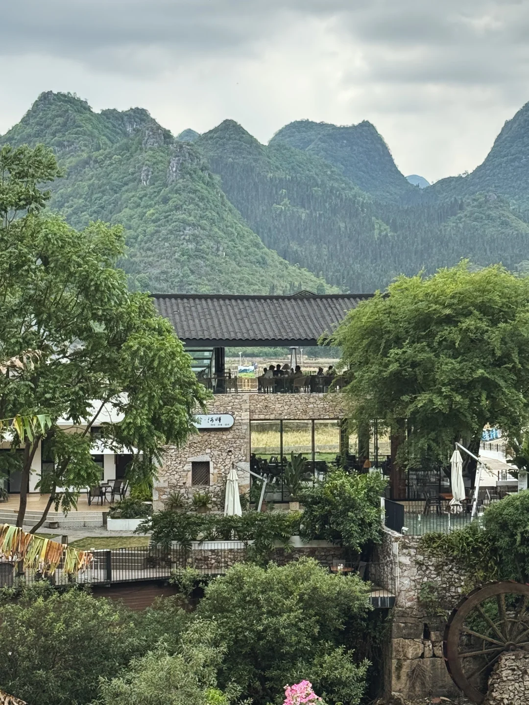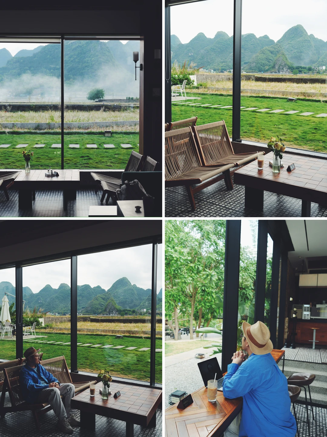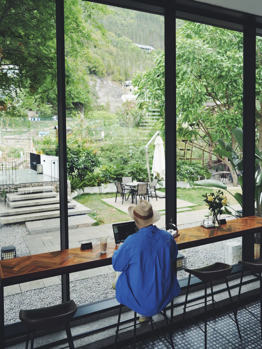 一楼临河玻璃窗:水光山色镜像感,飞哥拍了背影很喜欢