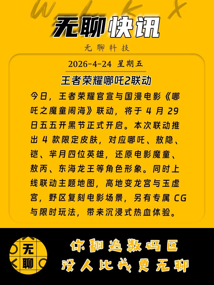 【王者荣耀哪吒2联动】今日,王者荣耀官宣与国漫电影《哪吒之魔童闹海》联动,将于 4 月 29 日五五开黑节正式开启。本次联动推出 4 款限定皮肤,对应哪吒、敖隐、铠、芈月四位英雄,还原电影魔童、敖丙、东海龙王等角色形象。同时上线联动主题地图,高地变龙宫与玉虚宫,野区复刻电影场景,另有专属 CG 与限时玩法,带来沉浸式热血体验。王者哪吒2联动有点东西