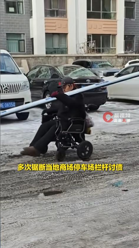 大爷也不是没想着用法律途径,可是一直没有进展,于是他采用了这种有点极端的方式。从去年11月开始,他就坐着轮椅,去锯商场停车场的拦车杆,锯下来就扛着走,到现在已经锯了30多根了。