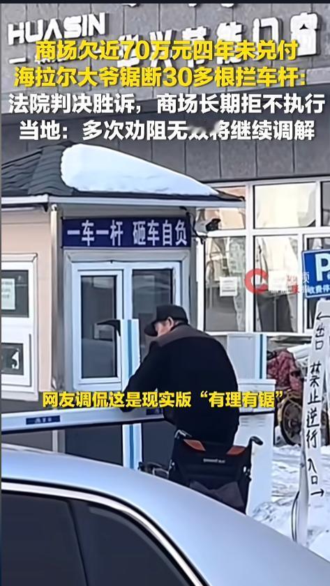 信息来源:《现实版“有理有锯”,商场欠近70万四年未兑付,海拉尔大爷锯断30多根拦车杆,当地回应:多次劝阻无效将继续调解》潇湘晨报·晨视频
