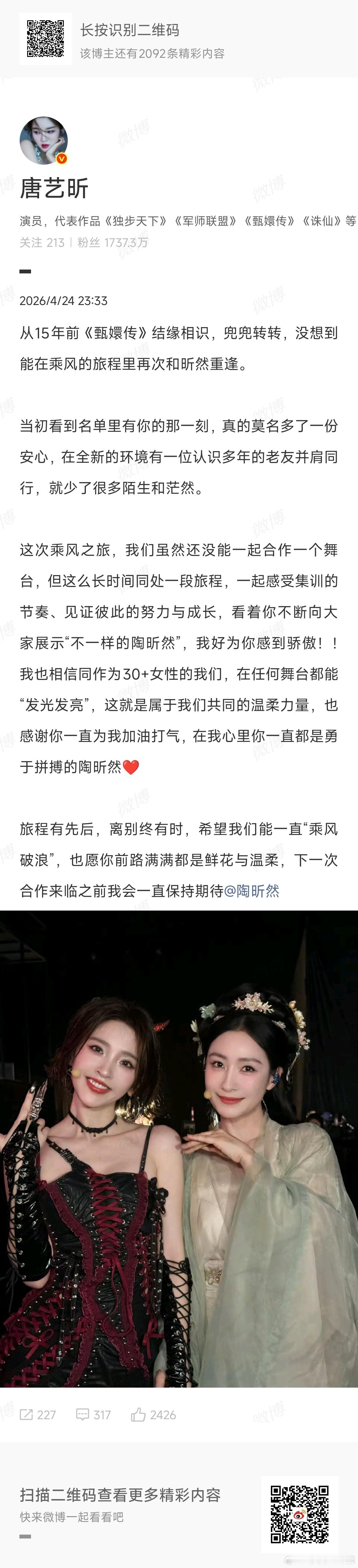 唐艺昕祝福陶昕然唐艺昕发文送别陶昕然,15年《甄嬛传》情谊在《乘风》重逢。虽未同