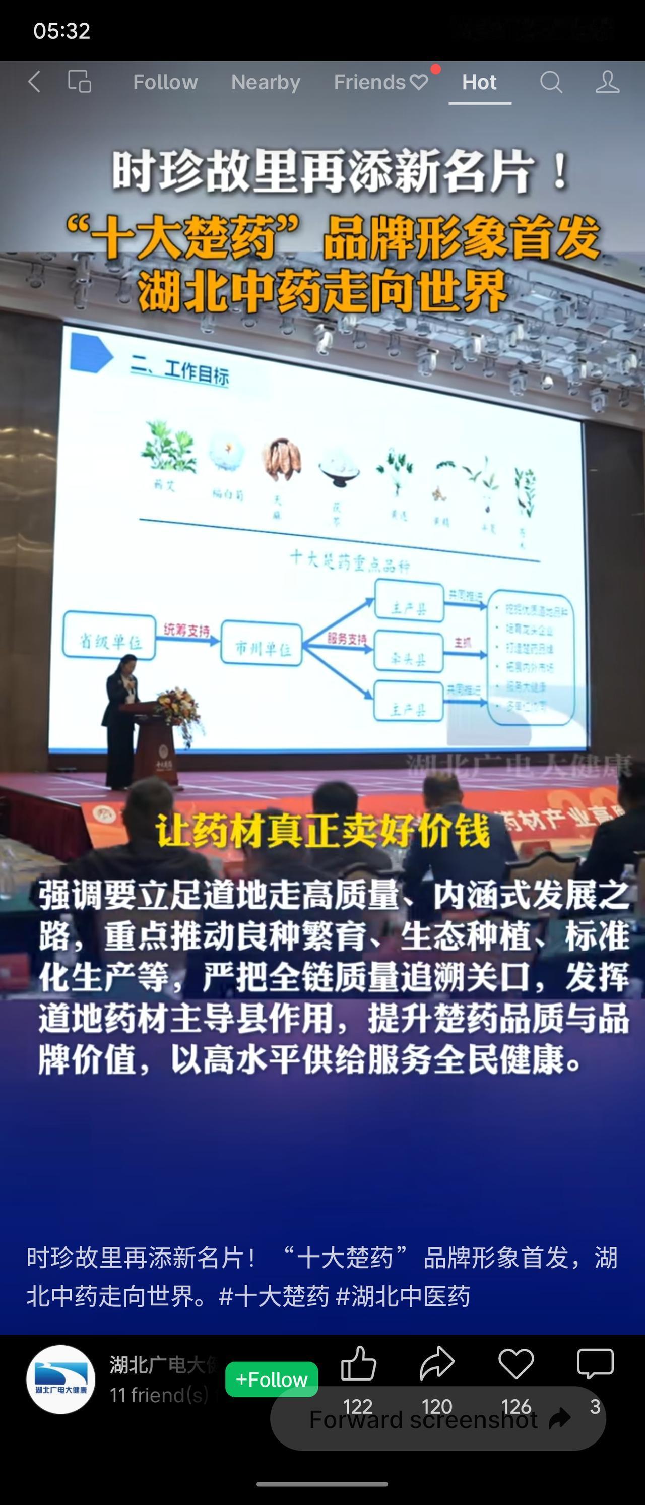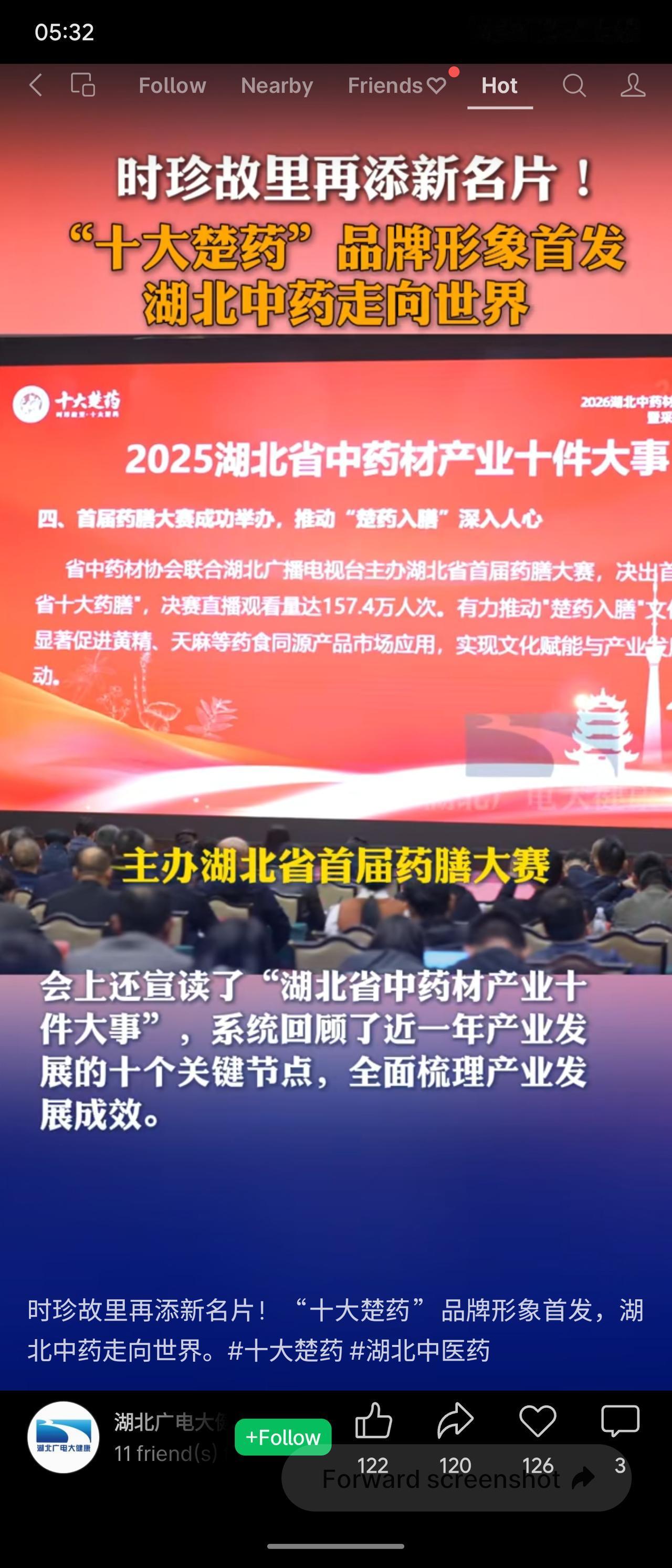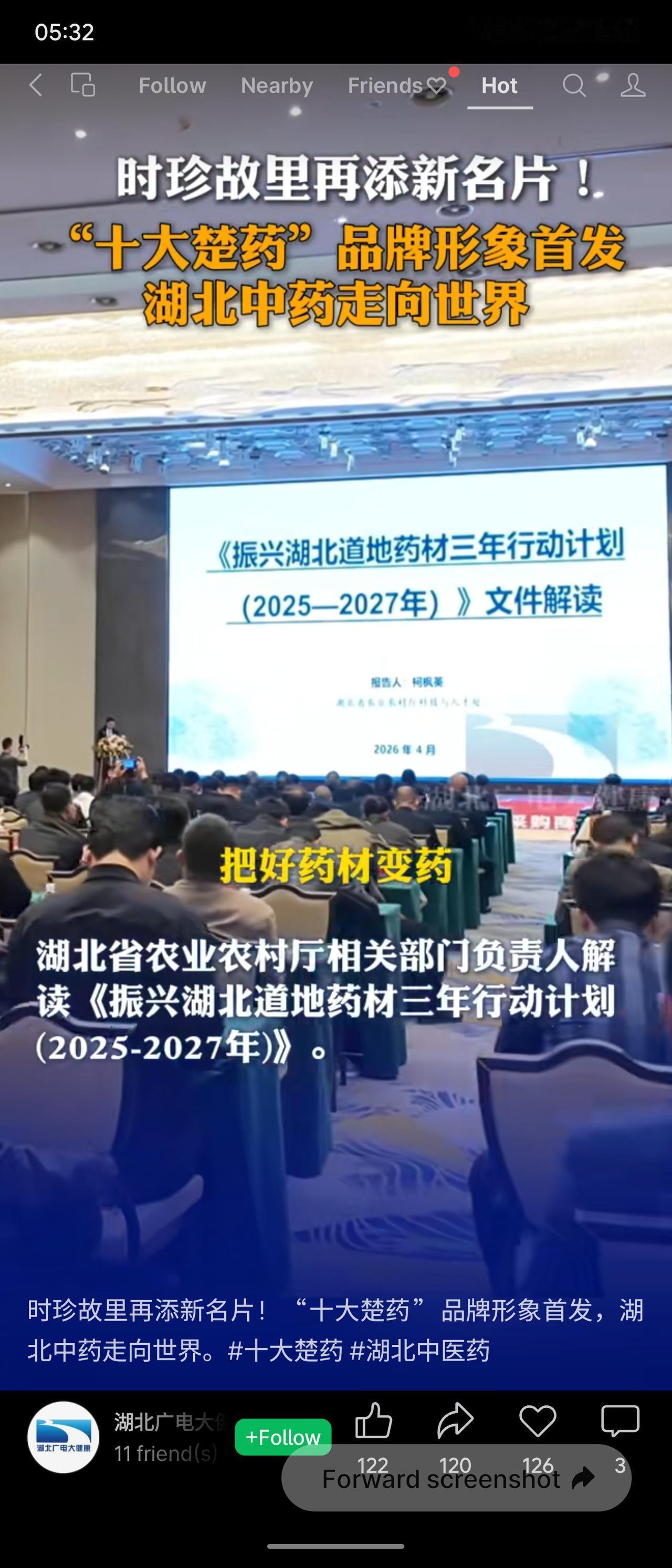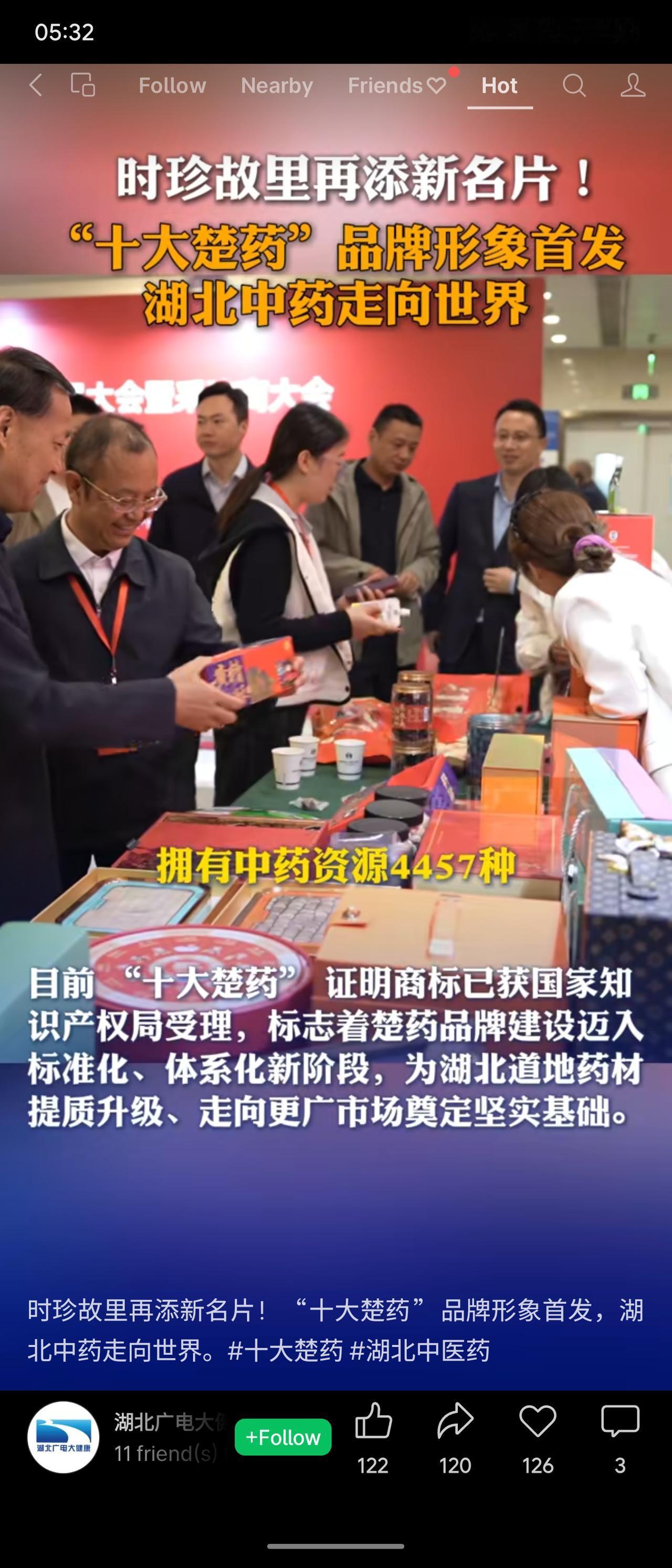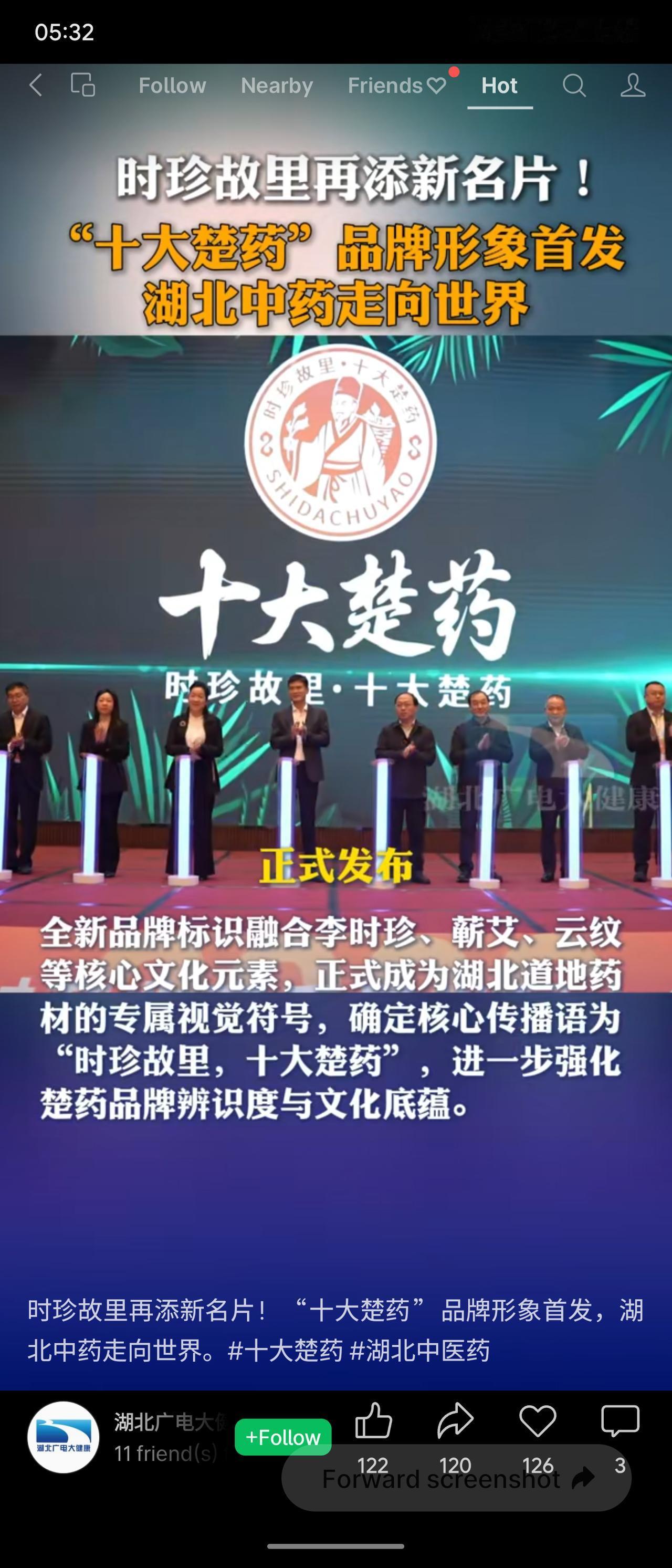 2026年4月23日,湖北中药材产业高质量发展大会在武汉召开,“十大楚药”品牌视觉形象全国首发。新标识融合李时珍、蕲艾、云纹等文化元素,传播语定为“时珍故里,十大楚药”。会上解读了《振兴湖北道地药材三年行动计划(2025-2027年)》,重点推动良种繁育、生态种植及全链质量追溯,提升楚药品牌价值。同时发布年度十件大事,包括首届药膳大赛,促进“楚药入膳”。“十大楚药”证明商标已获国家知识产权局受理,助力湖北中药走向世界。
