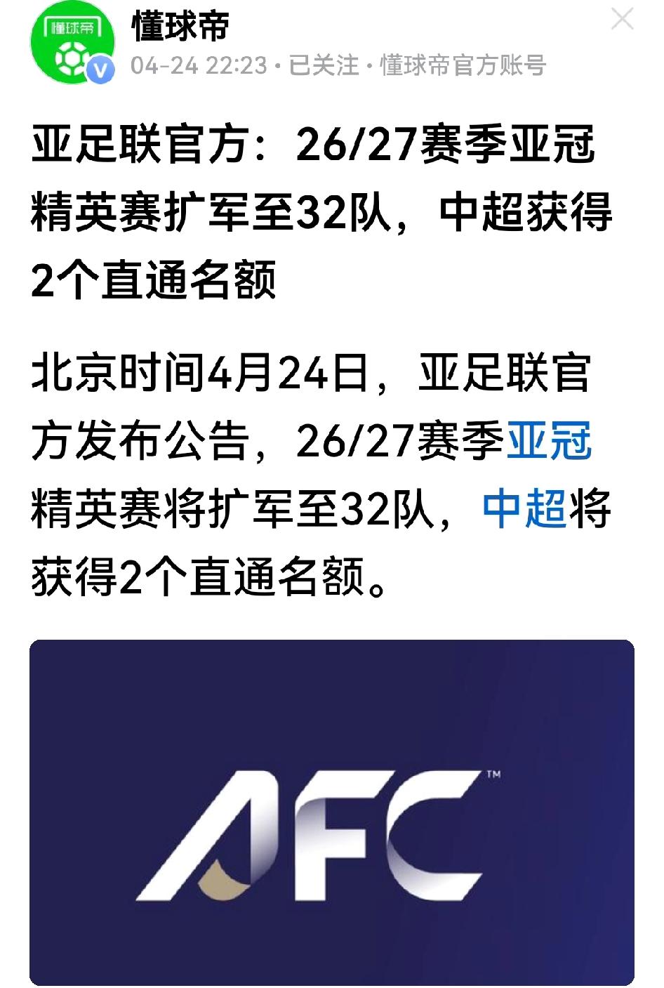 亚足联正式宣布26/27亚冠扩军方案,只把中超1个打精英联赛附加赛的名额改为直通正赛,不增加附加赛和亚二名额,足协杯冠军国安队成为唯一获利者,海港和申花按原计划参加亚精正赛和亚二联赛,蓉城并无重返亚冠机会。