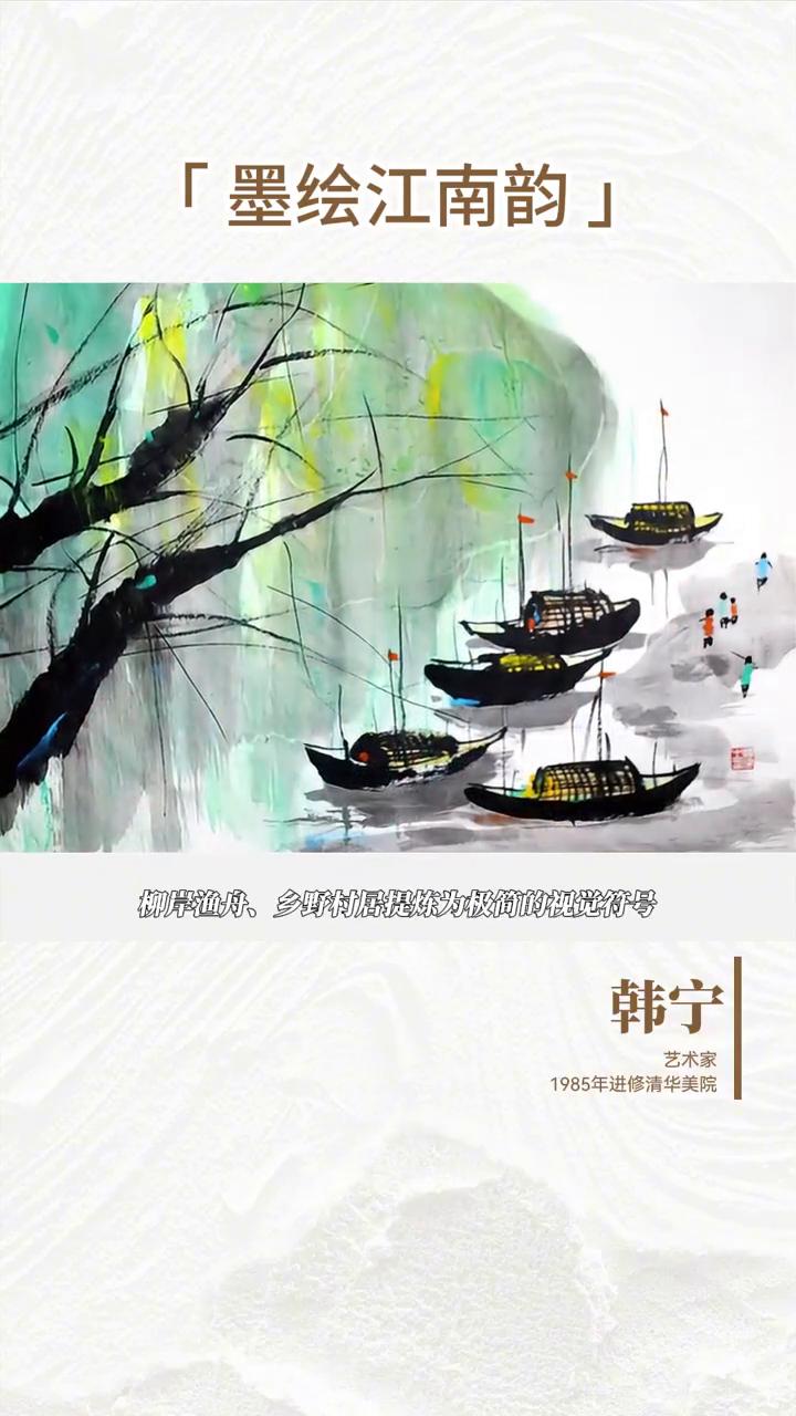 作品延续了韩宁标志性的"中西融合"创作脉络,以吴冠中式的诗意构图为骨融雕塑造型的精准与速写线条的灵动,将江南水乡的白墙黛瓦、柳岸渔舟、乡野村居提炼为极简的视觉符号。