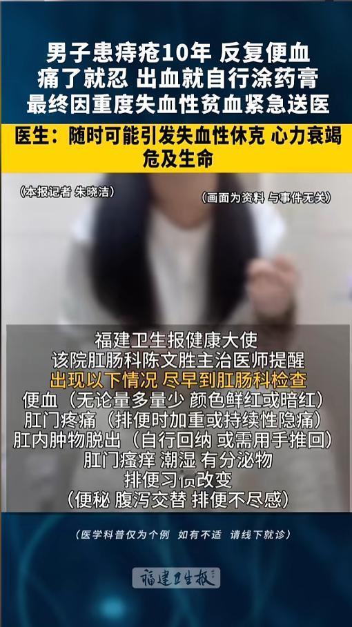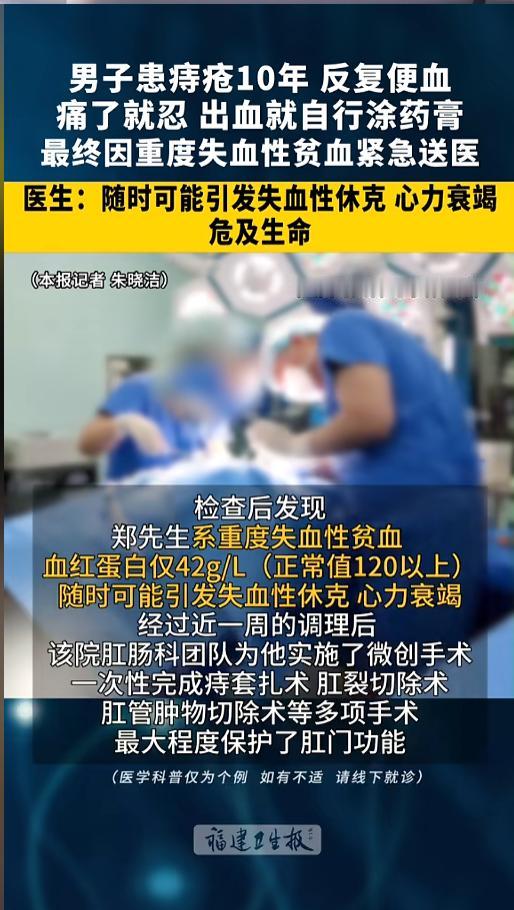 信息来源:《福建男子患痔疮10年,反复便血,痛了就忍,出血就自行涂药 最终因重度失血性贫血紧急送医!医生:随时可能引发失血性休克、心力衰竭,危及生命 健康 新闻 肛门 剧痛 出血