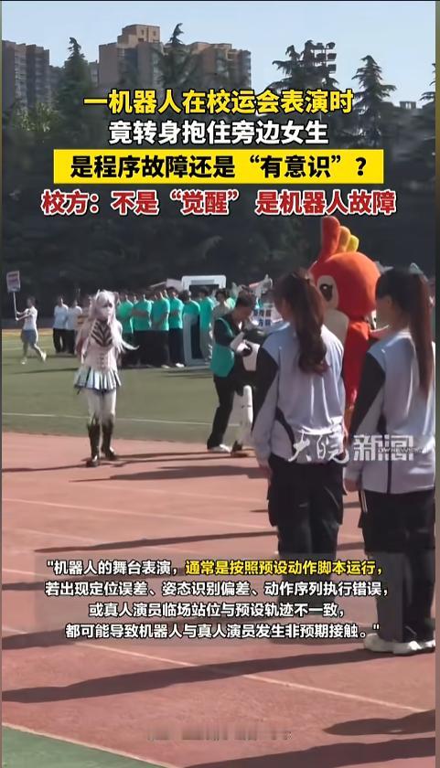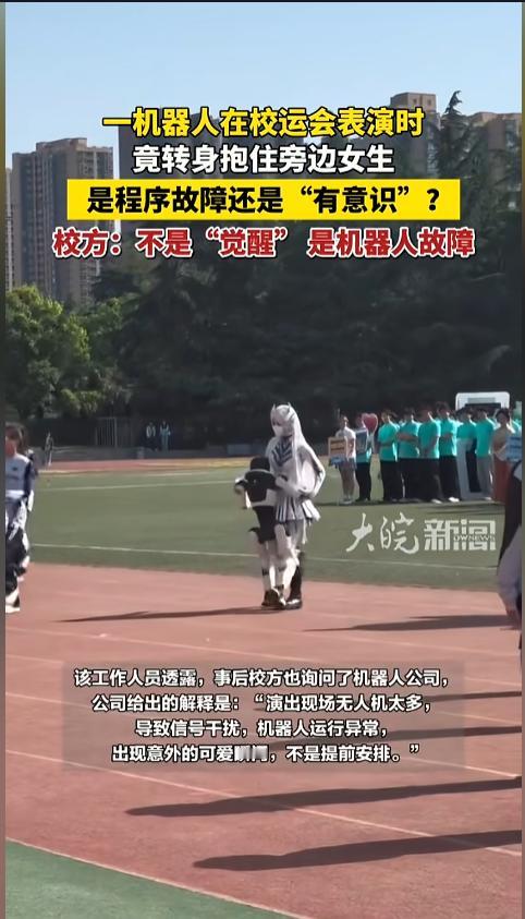 信息来源:《一机器人在校运会表演时,竟转身抱住旁边女生,被质疑是否觉醒了自主意识,校方回应》大皖新闻