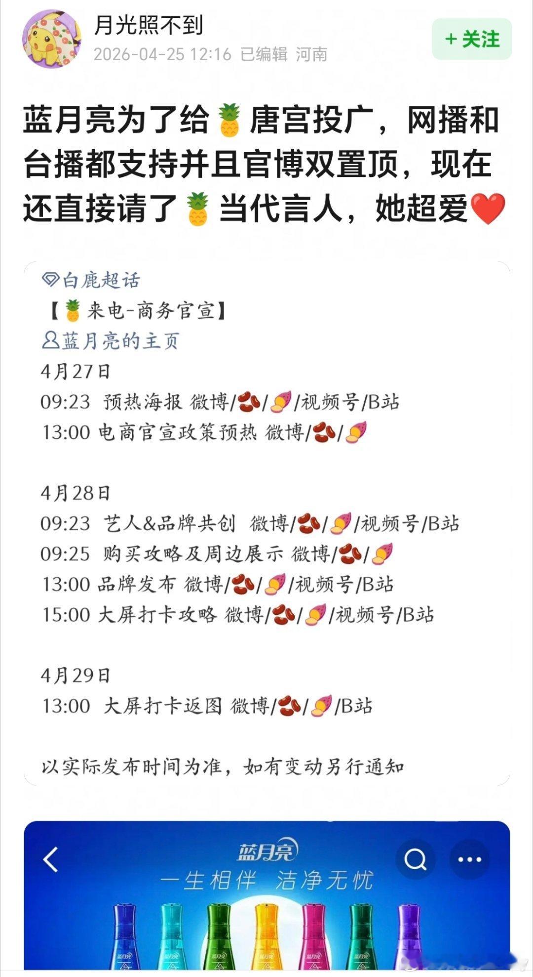蓝月亮真的超爱白鹿,为了给🍍的《唐宫奇案之青雾风鸣》投广,网播和台播都支持并且官博双置顶,现在还直接请了🍍当代言人,果然女明星的商业价值和火爆程度只有品牌霸霸知道!