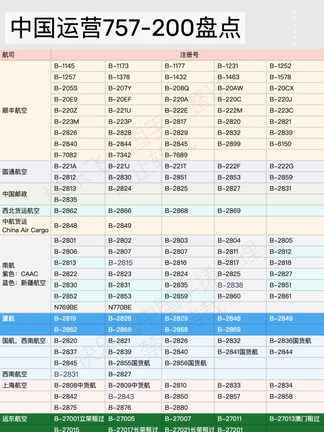 中国航司运营757-200,飞哥把注册号一个一个的贴出来了,在图片中,大家自行查看哈