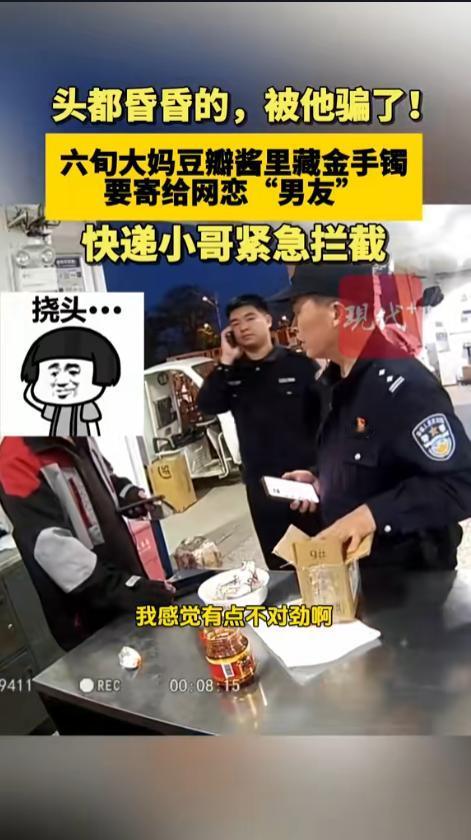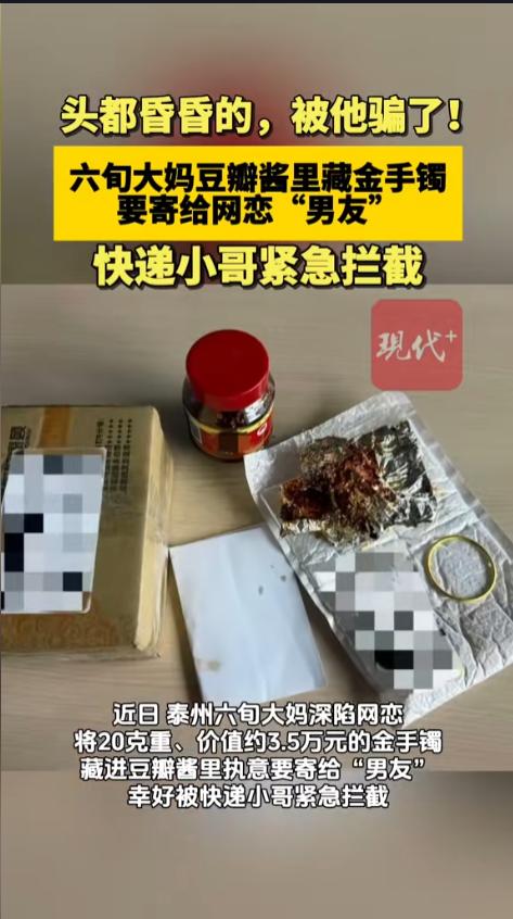 信息来源:《六旬大妈豆瓣酱里藏金手镯,要寄给网恋“男友”,快递小哥紧急拦截》现代快报