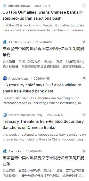 2026年4月15日,美国财政部长斯科特·贝森特在白宫简报会上正式宣布启动一项针对伊朗石油贸易的二级制裁行动,矛头直指中资银行。贝森特在讲话中表示,美国已向两家中国境内的银行发出正式警告函,如果能够证实伊朗资金通过中国银行的账户流转,美方将“愿意施加二级制裁”。与此同时,美国财政部还向中国内地、香港、阿联酋及阿曼的金融机构发出信函,威胁要将继续与伊朗开展业务的银行踢出美元结算体系。信中还披露,伊朗在2024年通过空壳公司——尤其是在香港和阿联酋注册的公司——在美国代理账户中处理了至少90亿美元的资金。