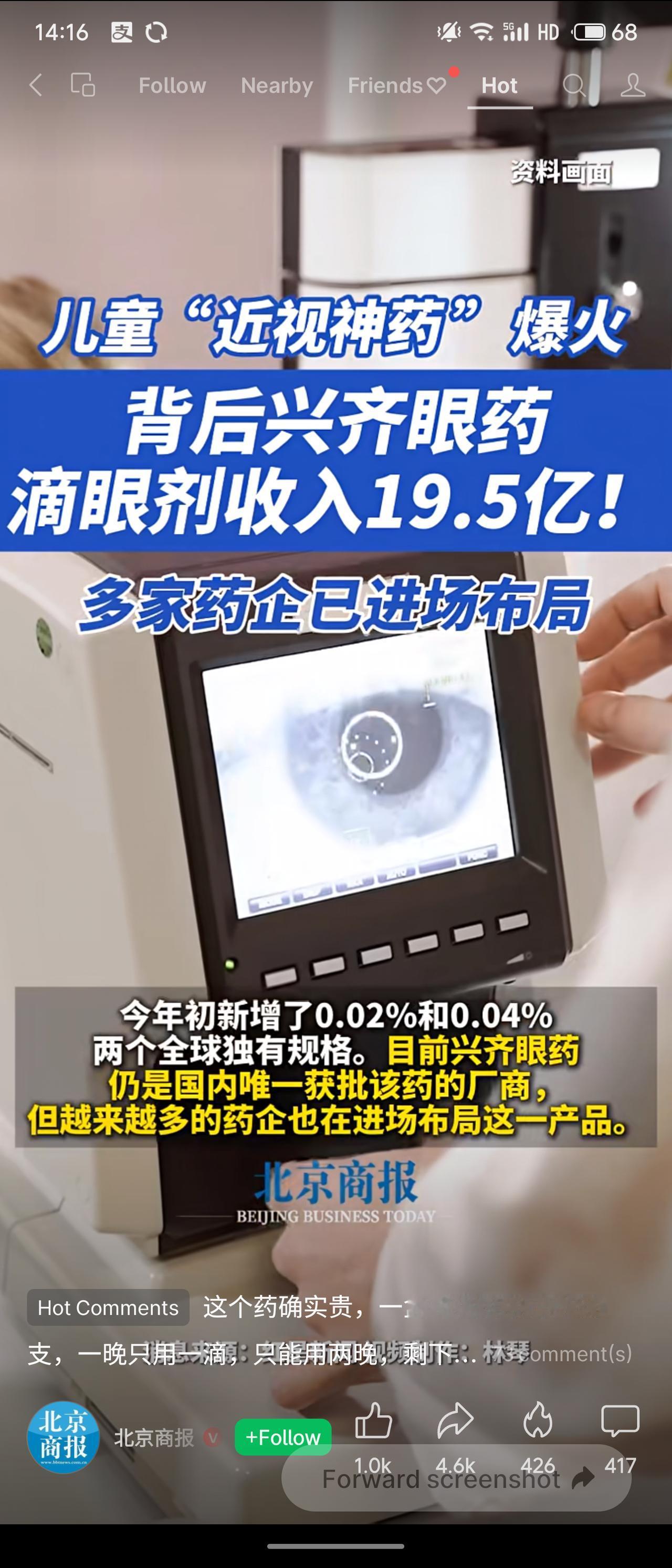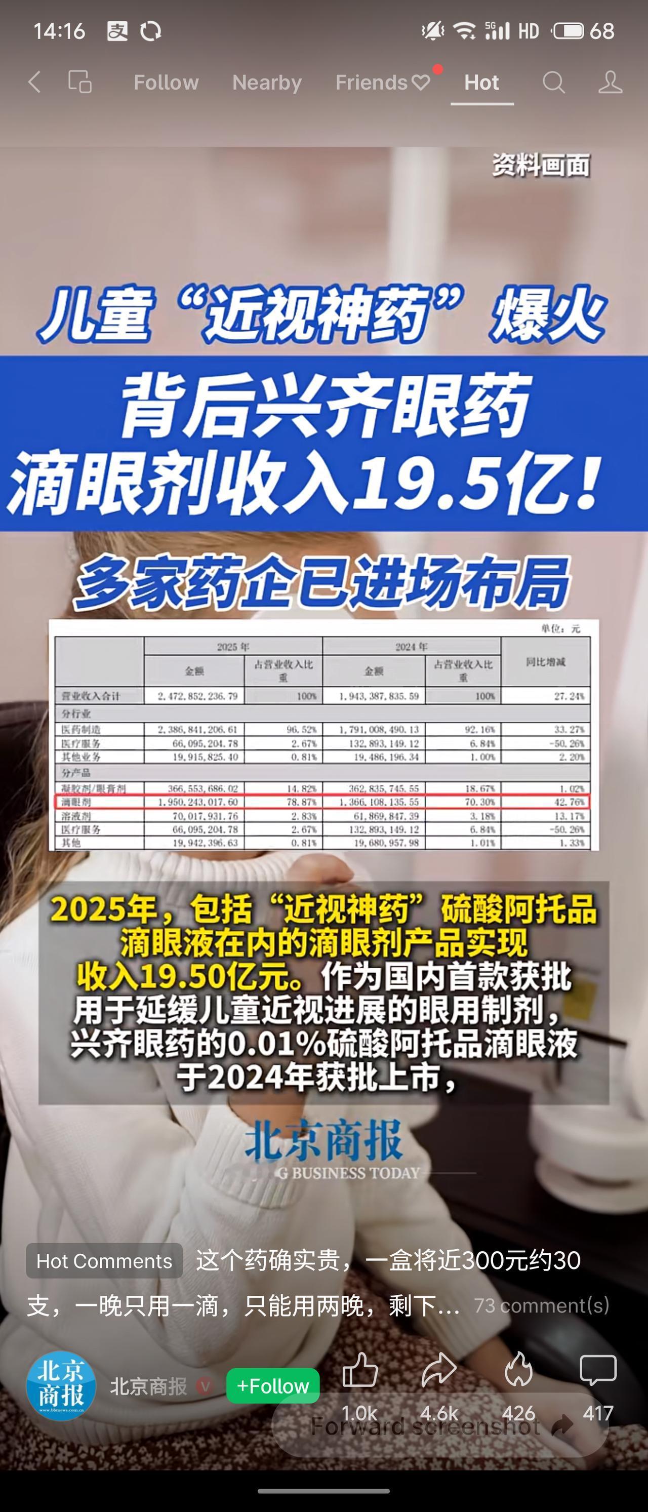 兴齐眼药2025年营收24.73亿元,净利润6.96亿元,其中滴眼液收入19.5亿元(同比增长42.76%),主要得益于儿童“近视神药”硫酸阿托品滴眼液。该药2024年获批上市,用于延缓6-12岁儿童近视进展,2025年新增0.02%和0.04%两个全球独有规格。目前兴齐仍是国内唯一获批厂商,但多家药企已进场布局。该药一盒约300元(30支),价格不菲。