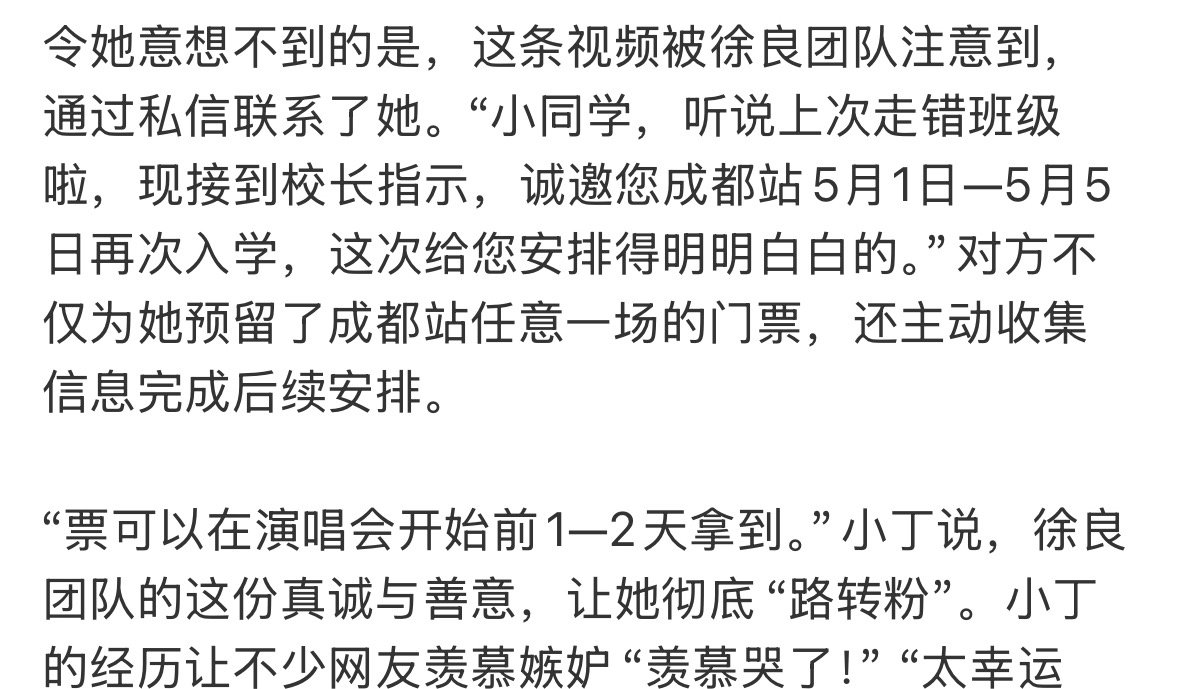 徐良团队给买错票粉丝赠票女生想看徐良演唱会,却因看错名字买成了光良的票。她把这段“乌龙”经历发到网上后,竟被徐良团队注意到,获赠了徐良五一成都站演唱会门票。网友纷纷表示羡慕,直呼“太幸运了”哈哈哈哈“这次一定要走对班级啊”