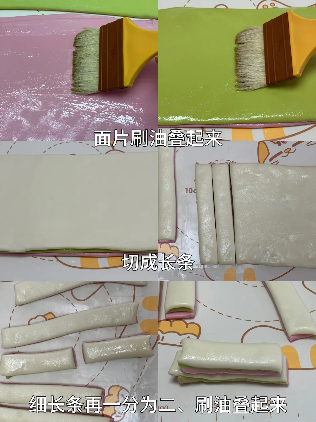 2️⃣面前表面刷上一层薄油,叠放起来,颜色根据自己喜好。