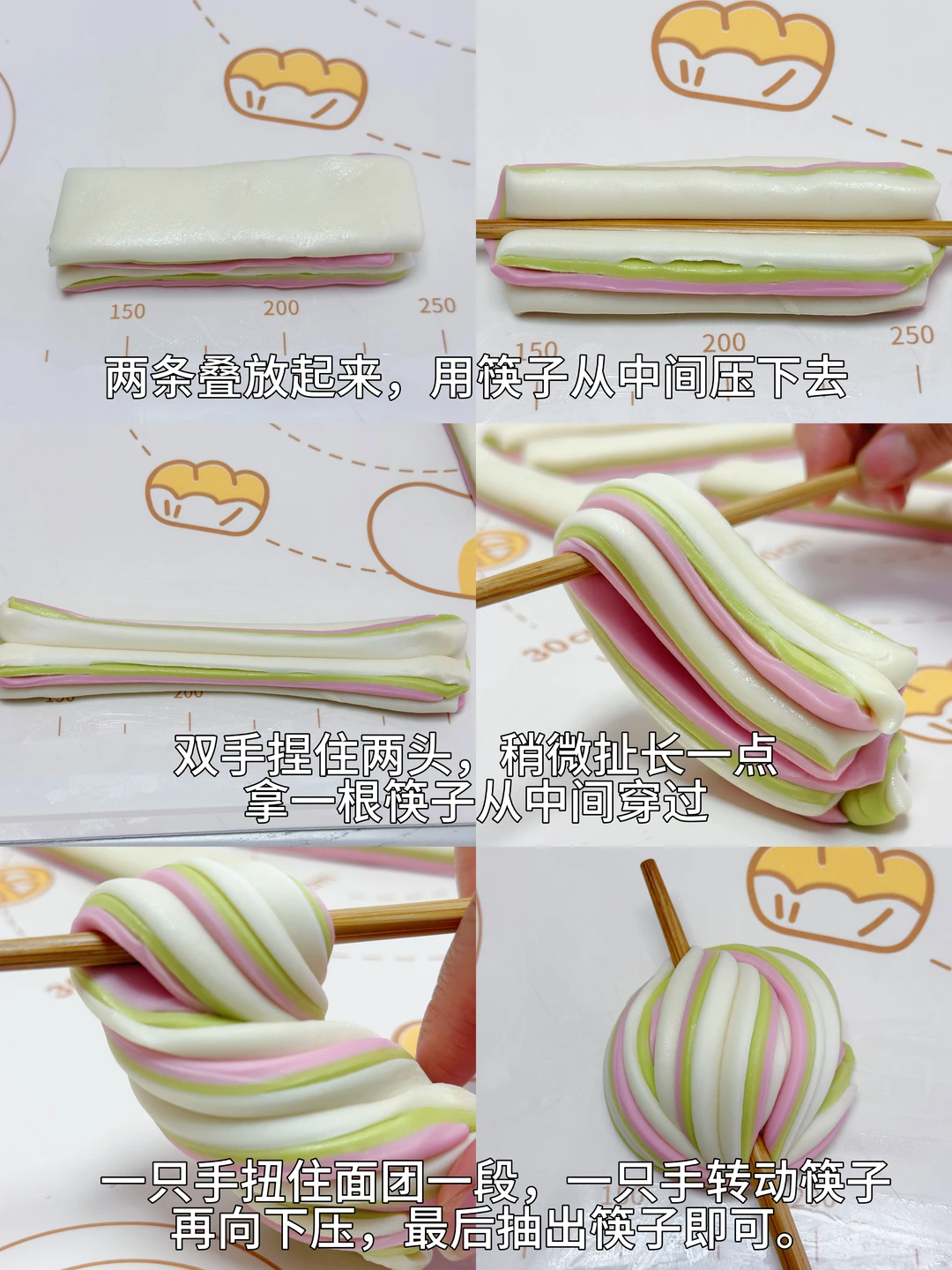 3️⃣用刀切成均匀的长方形剂子,再将两个剂子叠在一起,用筷子从中间向下压紧,然后从两端拉长一点,筷子放在面团底部中间处,将两端捏稳,筷子挑着面团顺时针转一圈,再从中间压下去,压紧,抽出筷子,花卷就卷好啦。