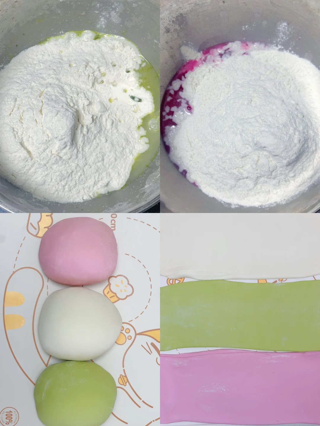 1️⃣分别把各个面团的食材混合揉匀,揉成光滑面团,再各自擀成光滑的长方形面片。
