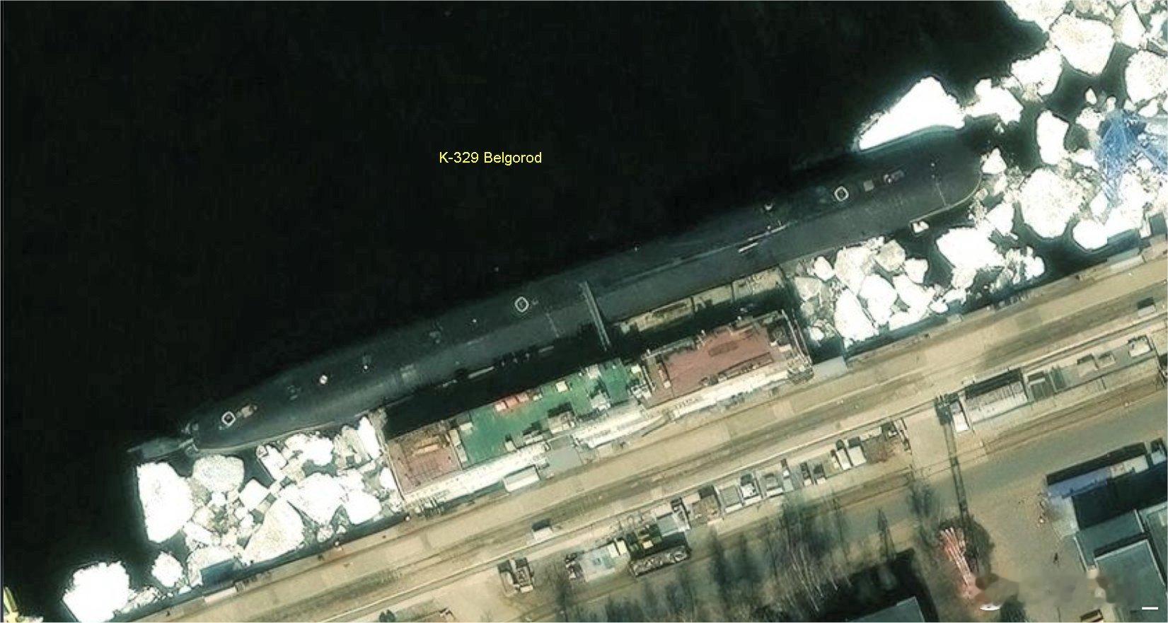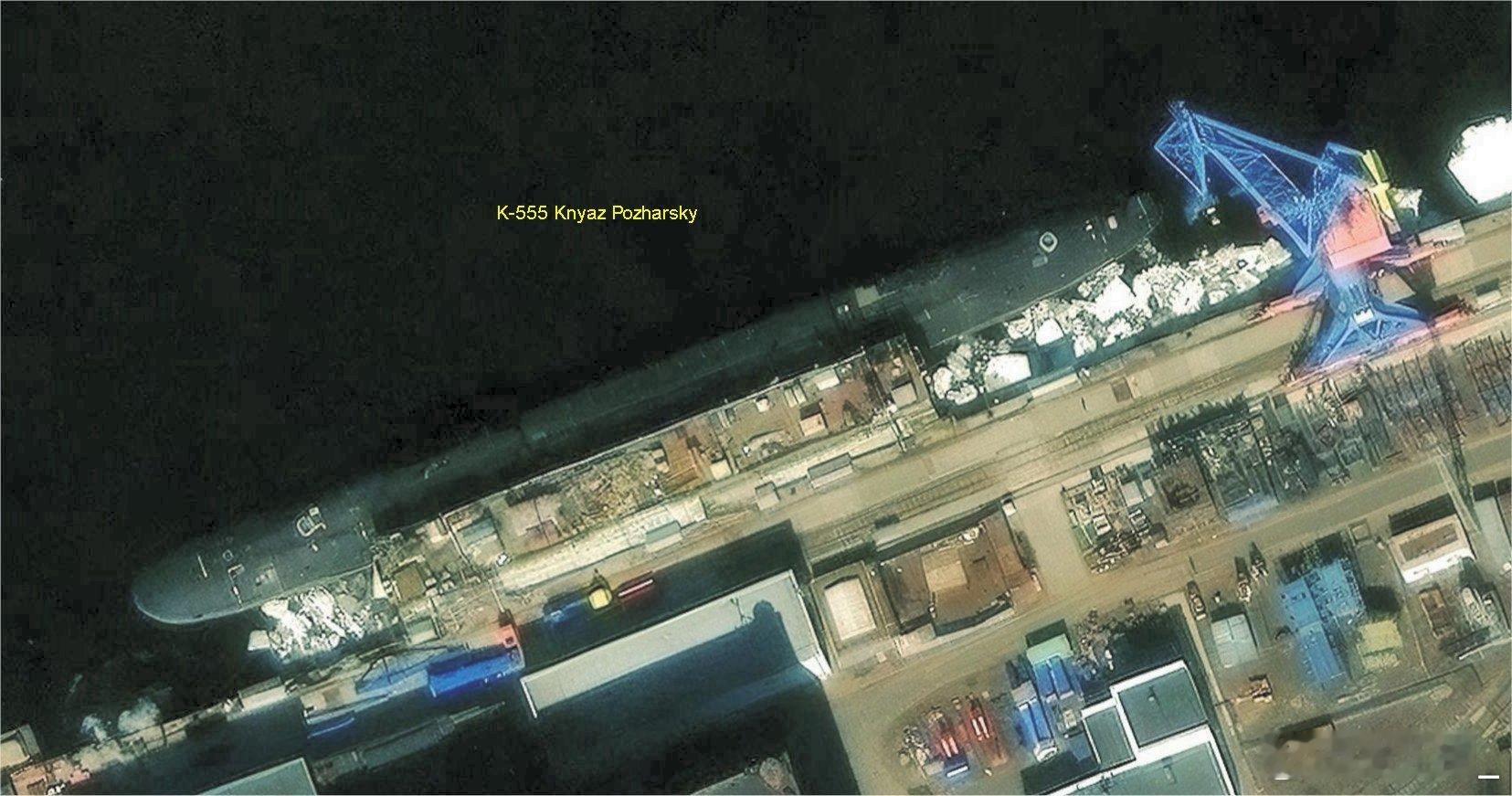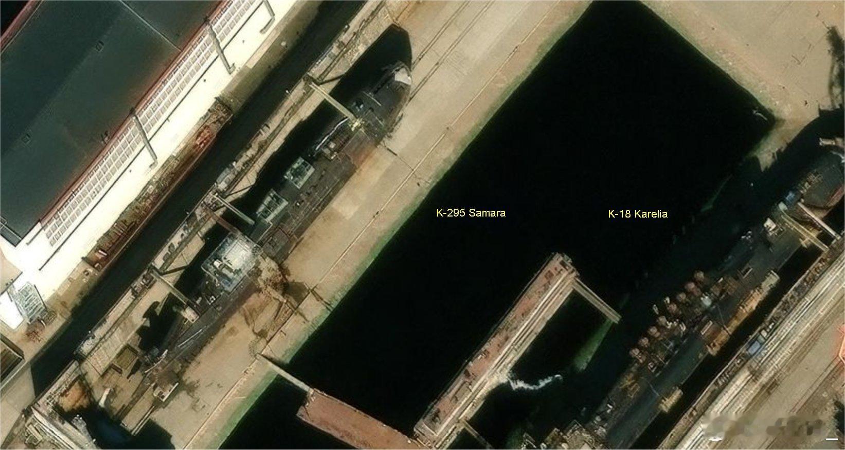 正在北德文斯克造船厂改装或维保的俄军潜艇:图一,K-328“豹”,971型阿库拉级攻击核潜艇;B-90“萨洛夫”,实验性柴电潜艇。图二,K-295“萨马拉”,971型阿库拉级攻击核潜艇(太平洋舰队);K-18“卡累利阿”,667BDRM型D-IV级战略核潜艇。图三,BS-329“别尔哥罗德”,09852型特种核潜艇。图四,K-555“波扎尔斯基大公”,955A型北风之神A级战略核潜艇。俄罗斯海军