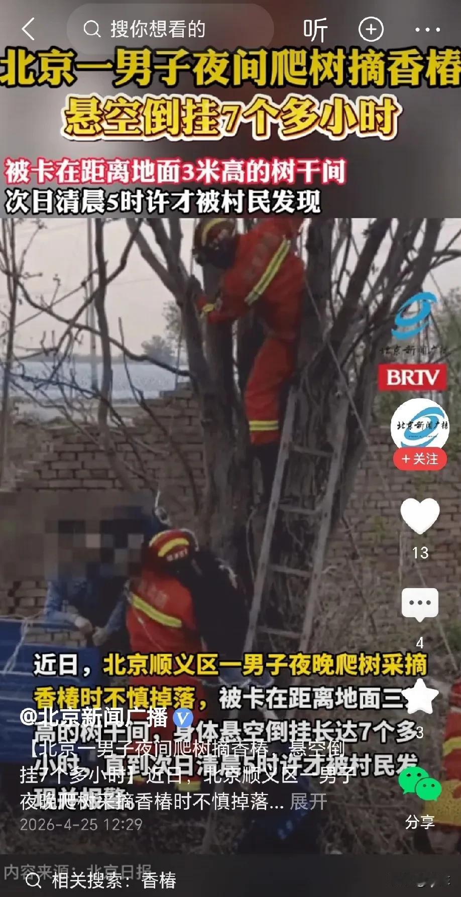 吃一口容易吗?北京顺义一男子夜间爬树摘香椿,不料脚下一滑跌落,整个人被卡在距离地面 3 米高的树干中间,直到第二天凌晨 5 点才被村民发现,倒挂了 7 个多小时,最终被消防队员给救了下来!