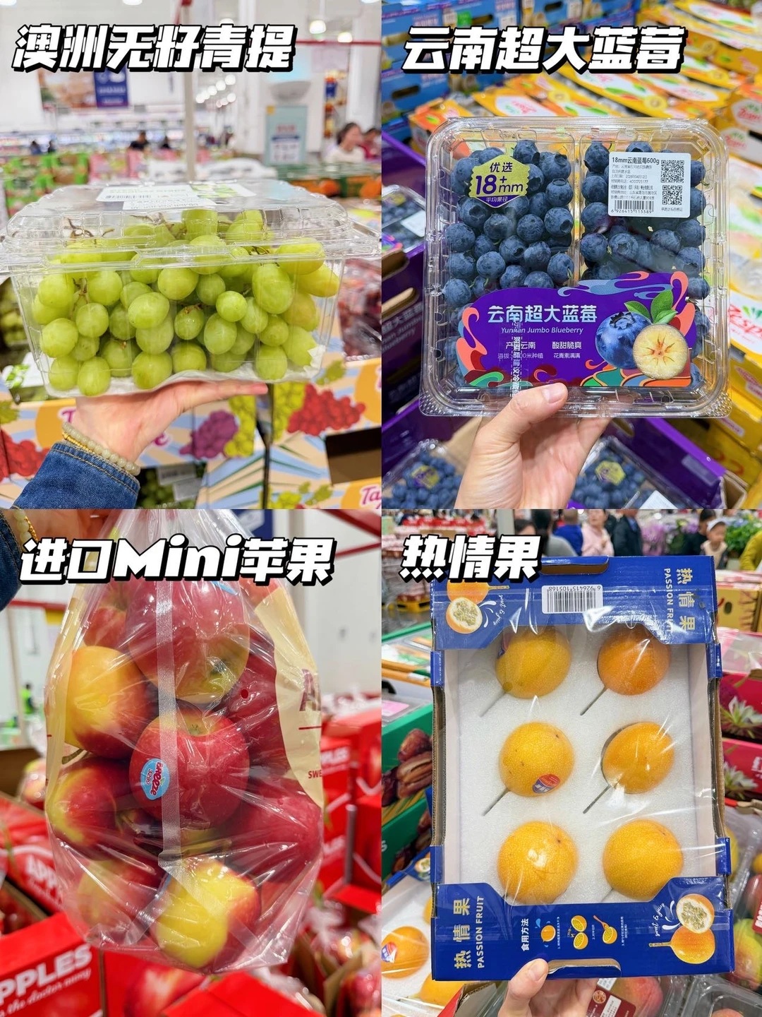 ✔️水果区:澳洲无籽青提、云南超大蓝莓、进口Mini苹果、热情果