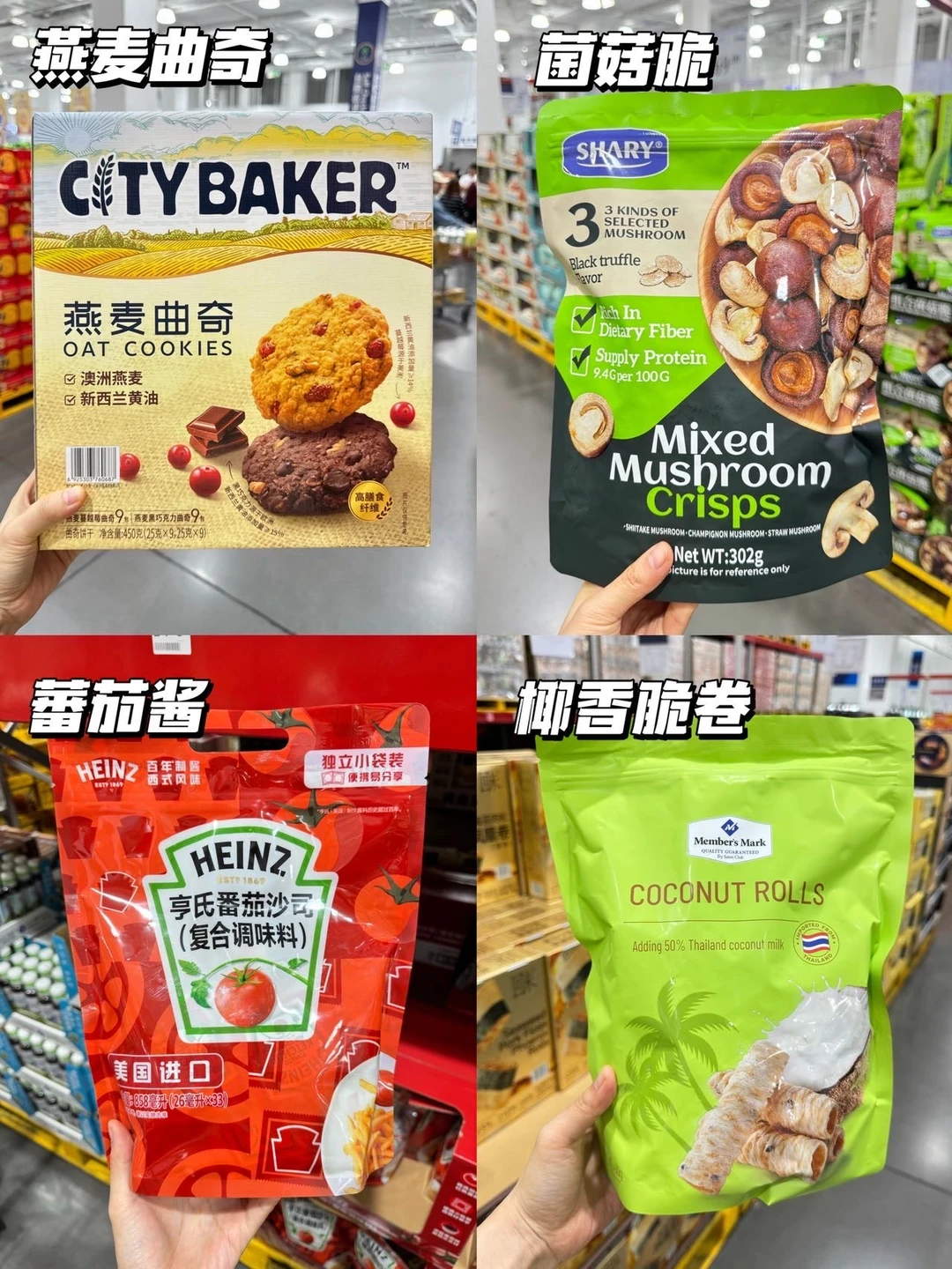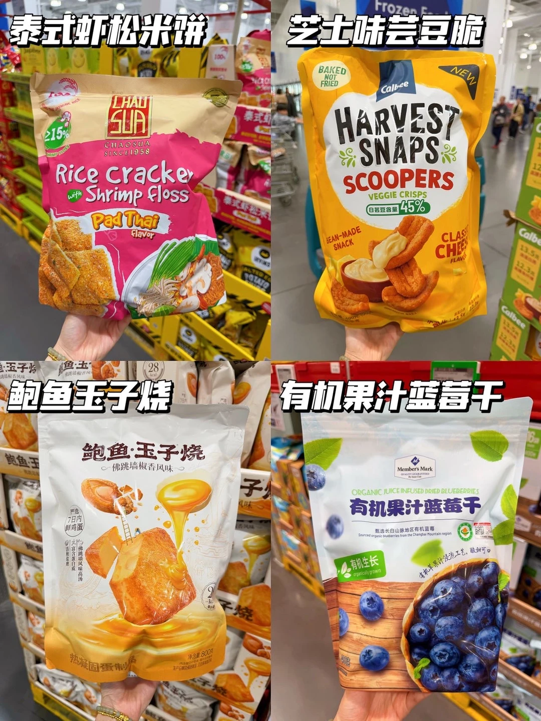 ✔️零食区:泰式虾松米饼、鲍鱼玉子烧、芝士味芸豆脆、有机果汁蓝莓干、燕麦曲奇、菌菇脆、蕃茄酱、椰香脆卷、