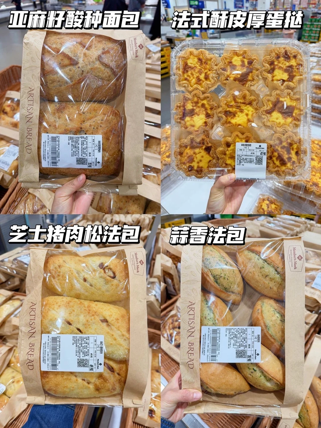 ✔️烘焙区:亚麻籽酸种面包、法式酥皮厚蛋挞、芝士猪肉松法包、蒜香法包