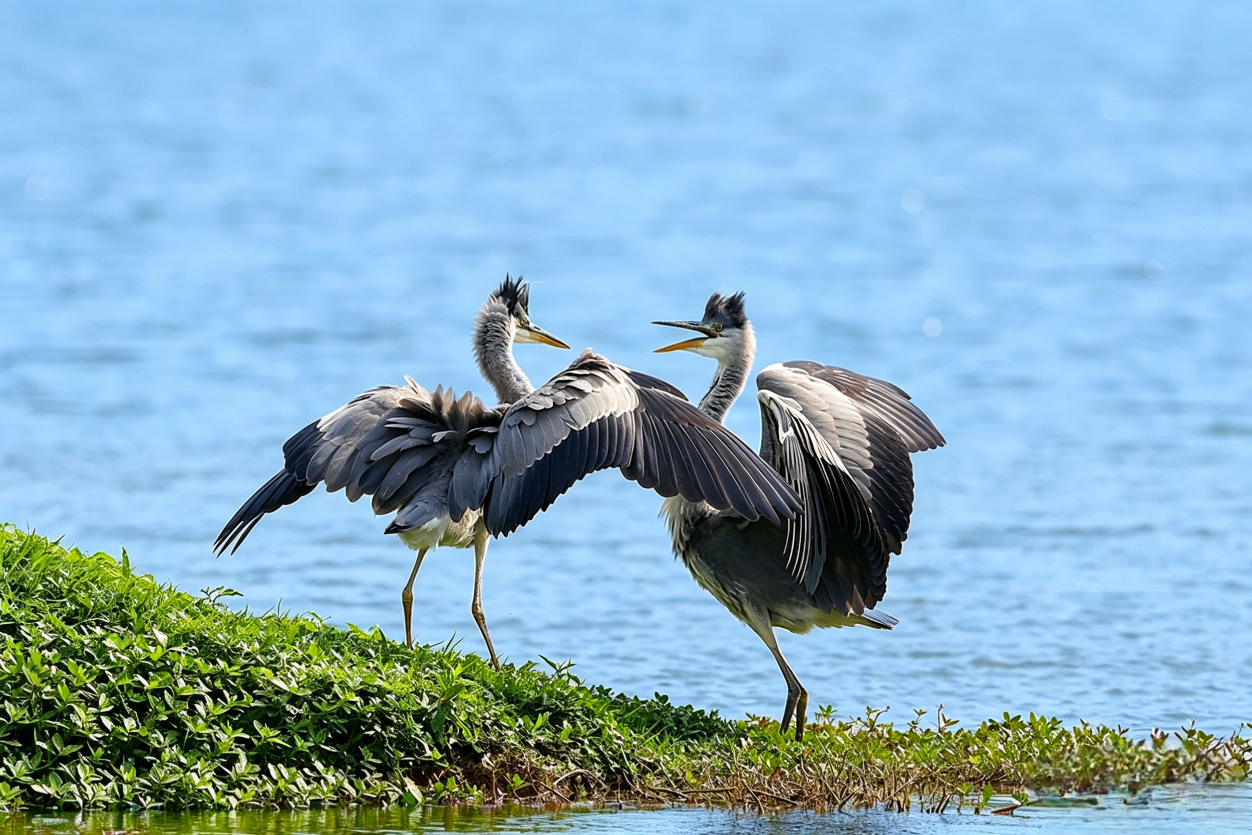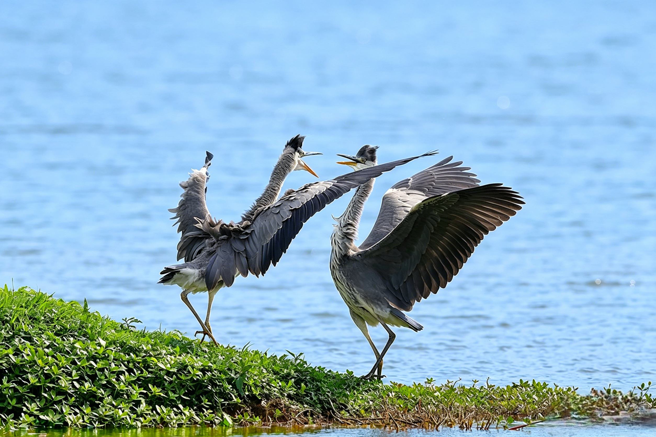 两只小家伙在水边草甸上,翅膀张得大大的,跟跳双人舞似的,喙还互相碰着,像在吵架又像在撒娇😆 当时蹲在芦苇丛后,冻得手指都僵了,但看到它们那呆萌的互动,瞬间觉得超有趣!