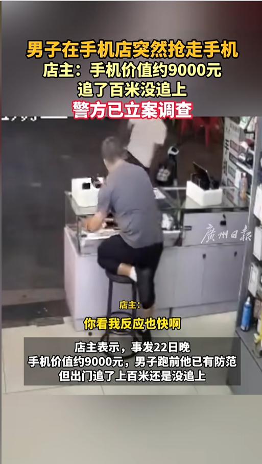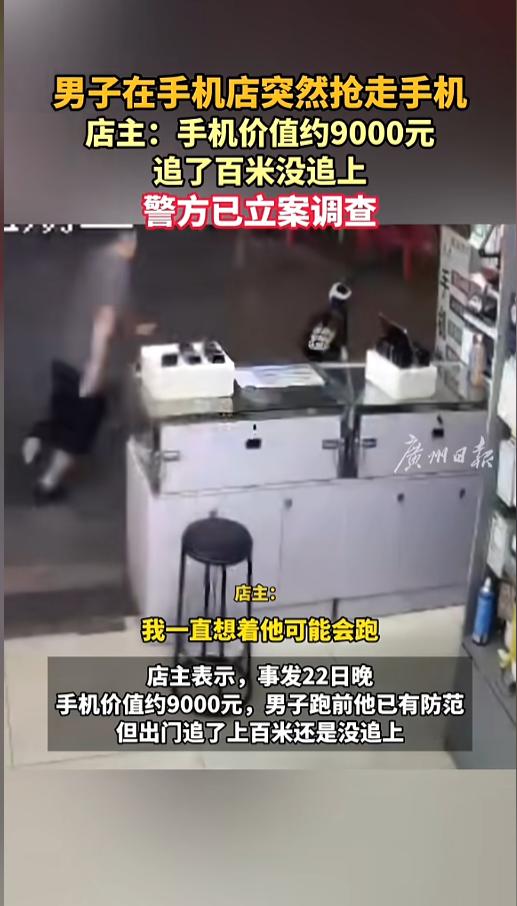 信息来源:《男子在手机店突然抢走手机 店主:手机价值约9000元 追了百米没追上 警方已立案调查》广州日报