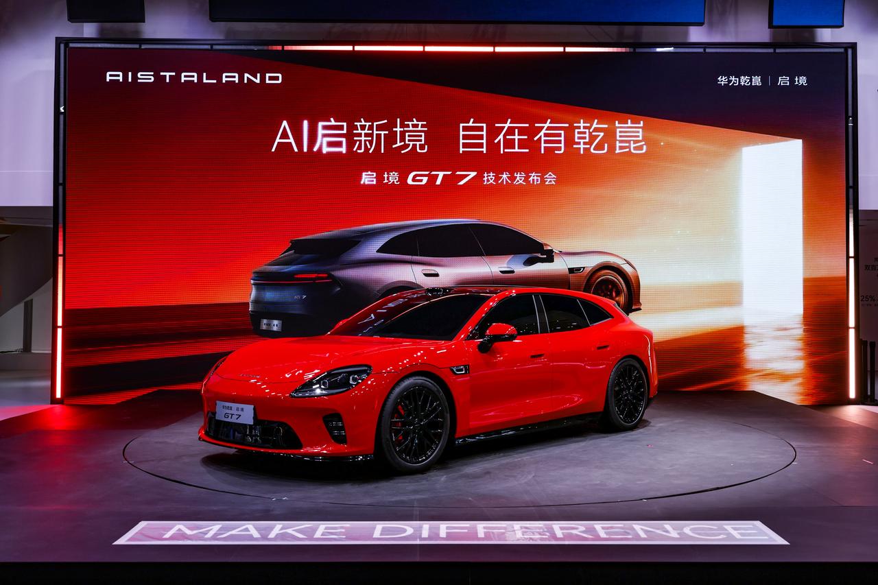 逛北京车展,多数展台围着新车拍外观。启境GT7首秀不一样,展台正中间摆了一台白车身。