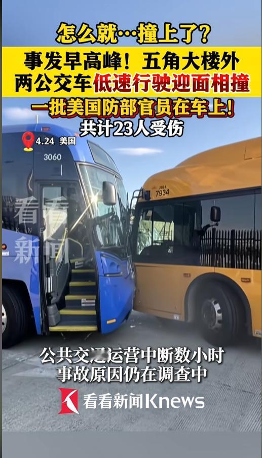 “人才啊!”当地时间4月24日,美国弗吉尼亚州,在五角大楼前发生了一起离奇的车祸。两辆低速行驶的公交车,在公交环道上迎头撞上,造成23人受伤,其中有10位还是五角大楼的官员,公共交通也中断了数个小时。网友:老美这也不行啊!