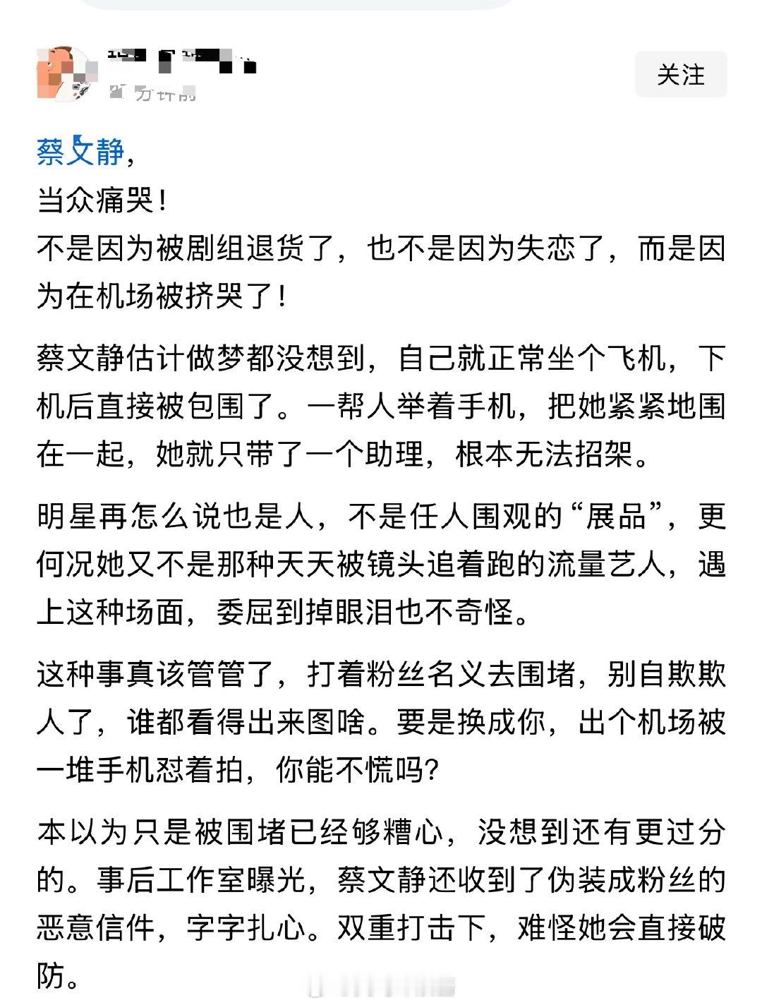 蔡文静,当众痛哭!不是因为被剧组退货了,也不是因为失恋了,而是因为在机场被挤哭了
