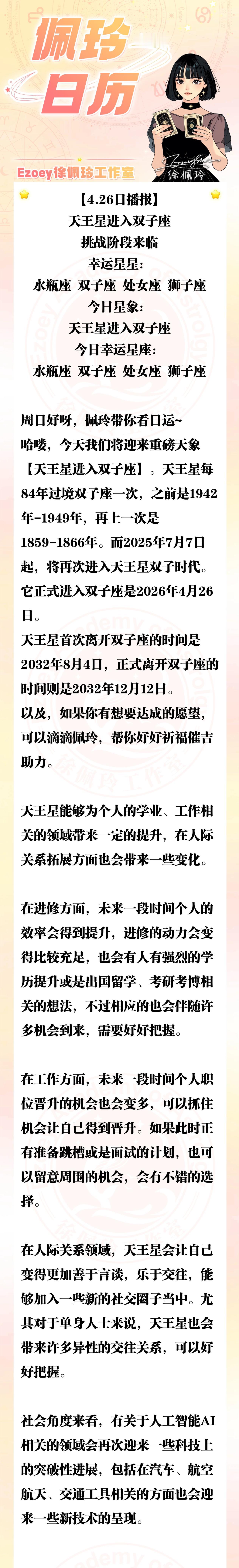 【4.26日播报】天王星进入双子座 挑战阶段来临 幸运星星:水瓶座、双子座、处女座、狮子座——Ezoey徐佩玲26年星座播报