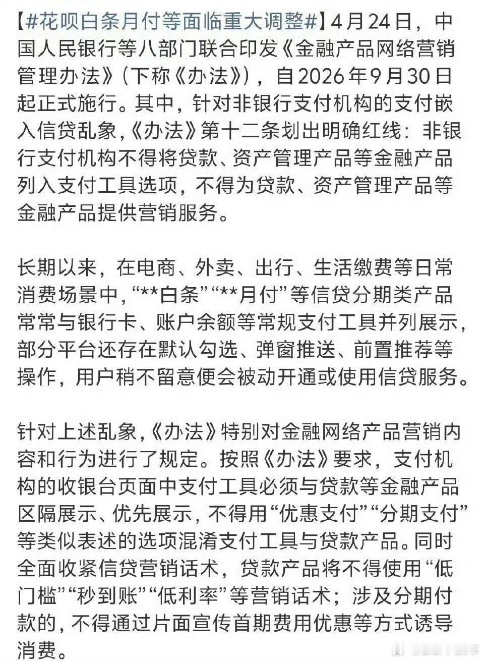 花呗白条月付等面临重大调整支付与信贷业务彻底拆分,杜绝诱导超前消费、捆绑借贷套路……每次支付总跳出来这些分期选项,还有藏在支付选项里面给消费者挖坑,手滑不小心就点到了。后面不会这样了,守住大家钱包,另外大家也切记不要超前消费。