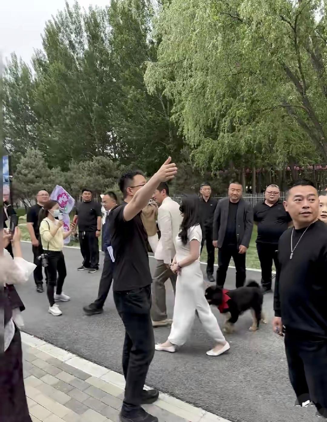 杜江一件白色西装,灰色裤子,显得高大挺拔,人确实帅气。他一只手牵着狗绳,一手不时拉着自己的西装扣子,看到很多人在拍摄,他很是拘谨。