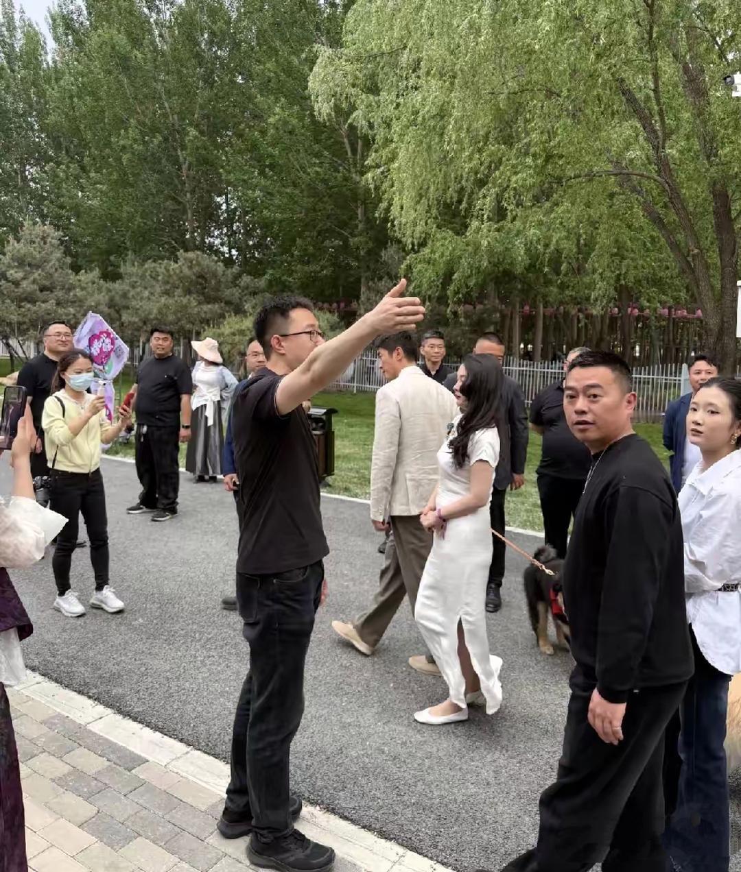4月25日,霍思燕和杜江在北京平谷桃园里的欢乐谷乐田园里带着救助的流浪狗狗,真的