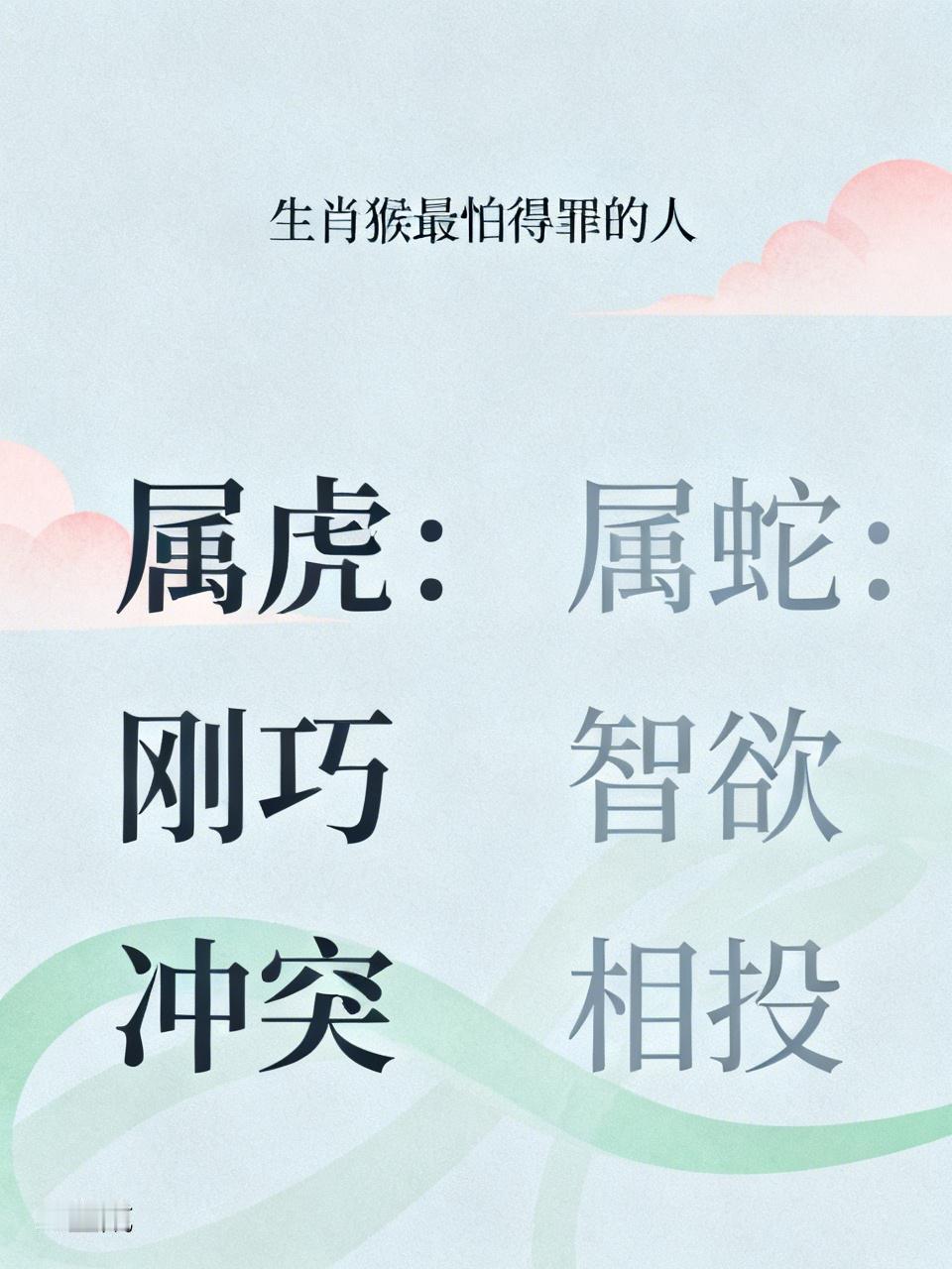 还有属蛇的。刚开始,属猴和属蛇可能因聪明而相互欣赏。但时间长了,猴子嫌蛇心思多、太冷淡,蛇觉得猴子太爱耍小聪明。不过,若能相互弥补,也可能成为不错的组合。所以属猴的可得和这两类人好好相处,别轻易得罪。