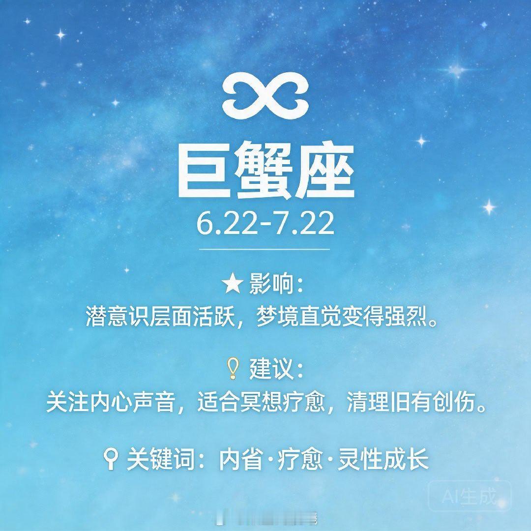 ♋ 巨蟹座:潜意识层面活跃,梦境、直觉变得强烈。关注内心声音,适合冥想、疗愈,清理旧有创伤。