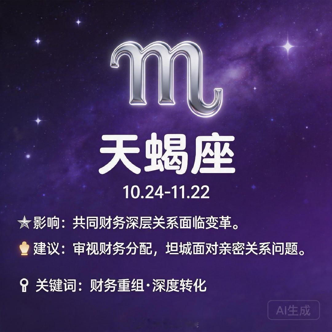 ♏ 天蝎座:共同财务、深层关系面临变革。审视财务分配,坦诚面对亲密关系中的问题。