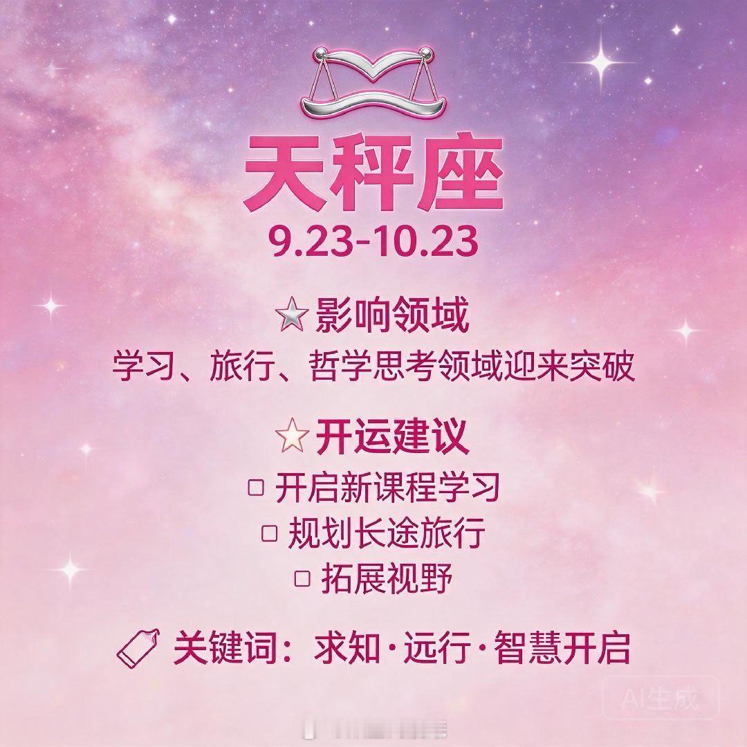 ♎ 天秤座:学习、旅行、哲学思考领域迎来突破。适合开启新课程学习或规划长途旅行,拓展视野。