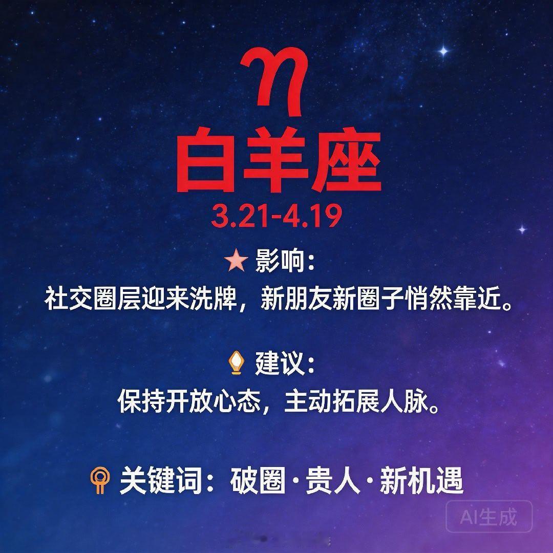 ♈ 白羊座:社交圈层迎来洗牌,新朋友、新圈子悄然靠近。保持开放心态,主动拓展人脉,但需警惕冲动交友。