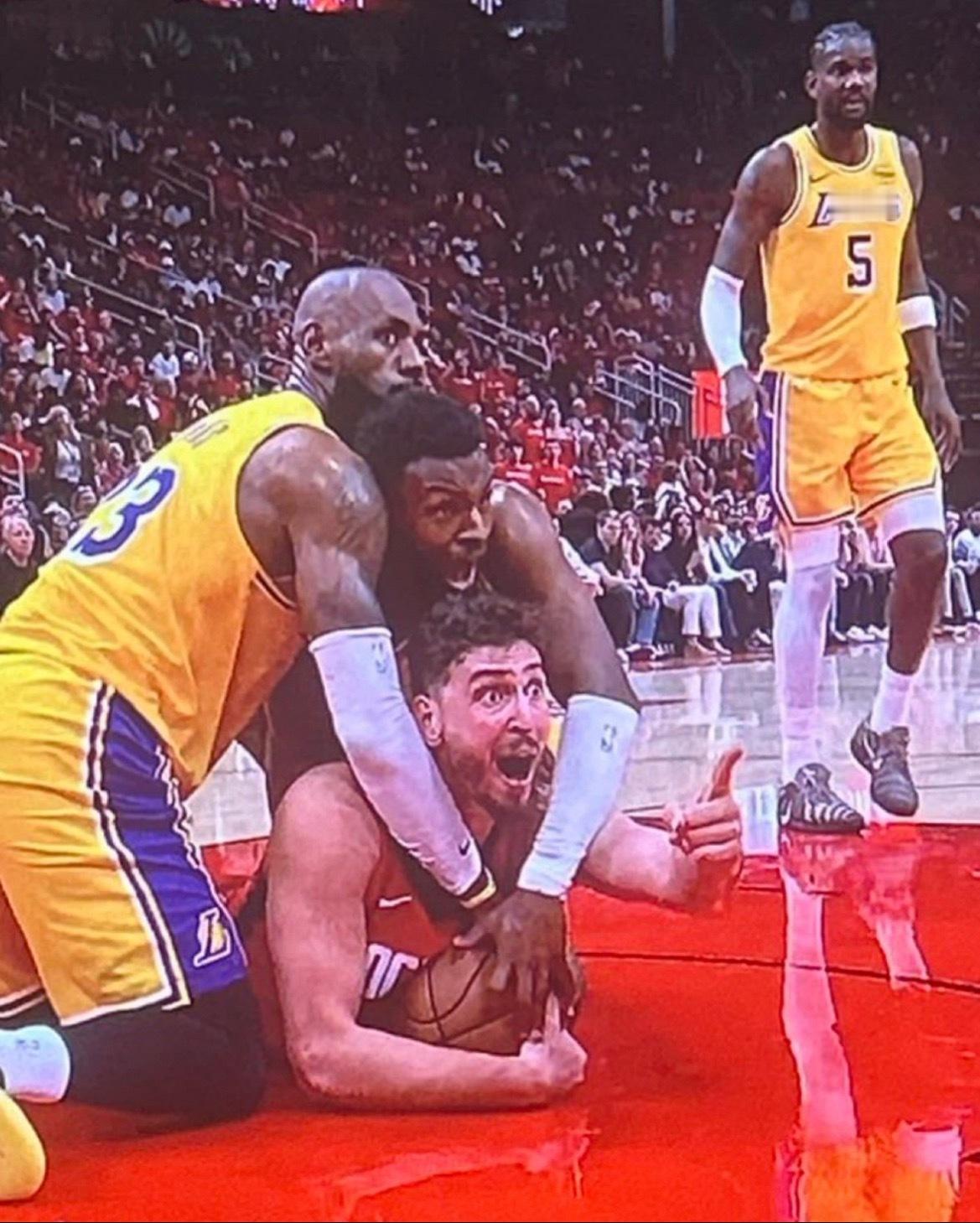 又是一副世界名画,詹姆斯和大儿子布朗尼联手在申京手里拿回球权。湖人vs火箭湖人3